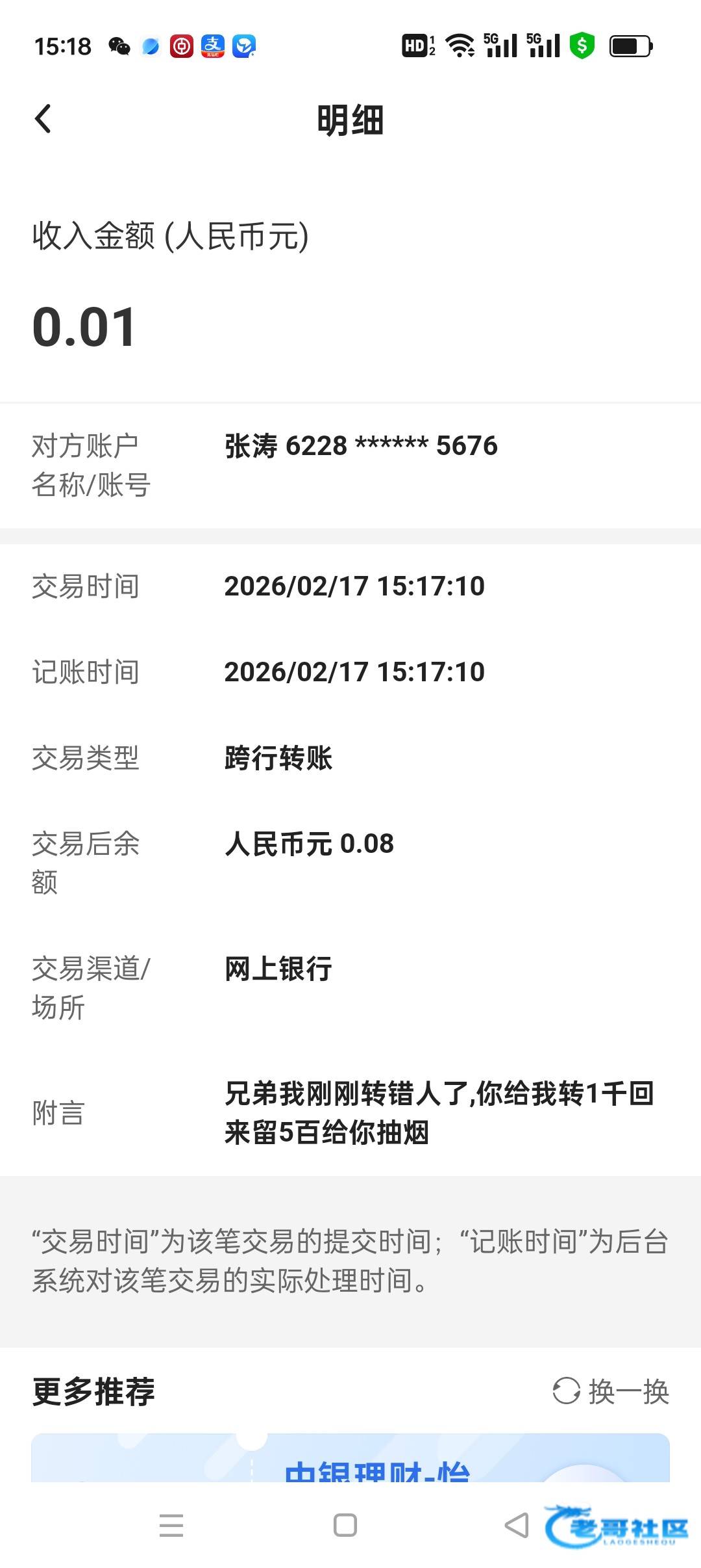 就那么凑巧呢 这张卡几百年没进账了 刚好提100就进了一笔1500的 ,我也是服了 他转错卡了 他是怎么知道我的卡号的 我都真的疑惑 ,