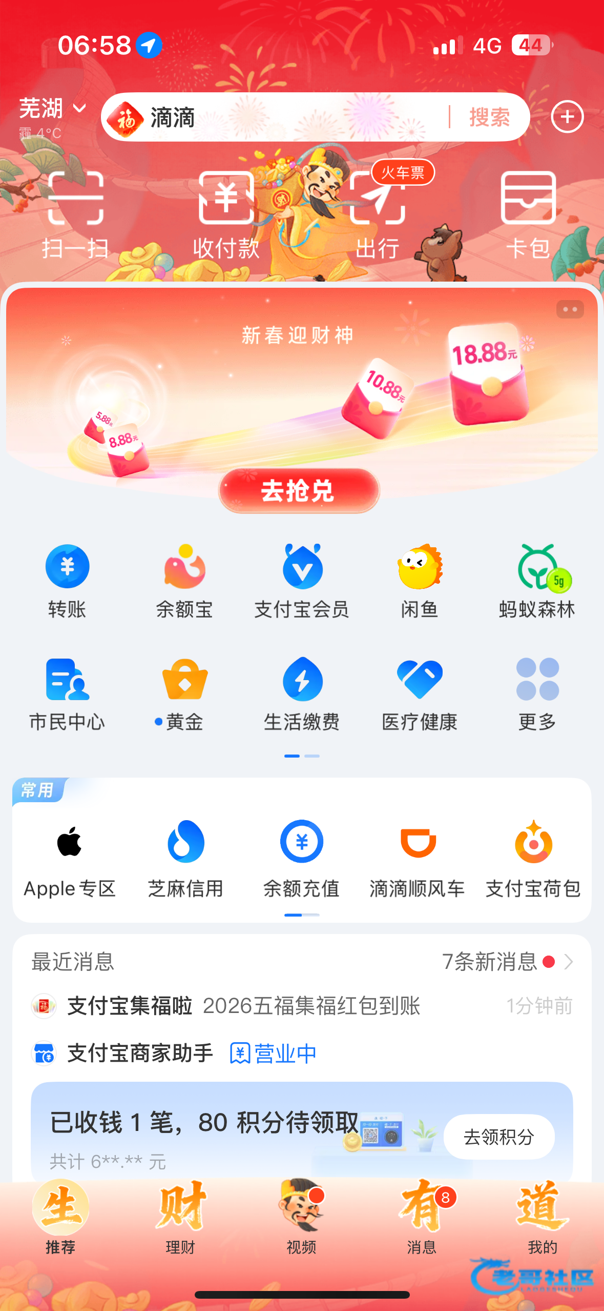 首页点新春迎财神进去,直接就可以提现到余额,之前弄过的集过福卡的,应该都可以领取