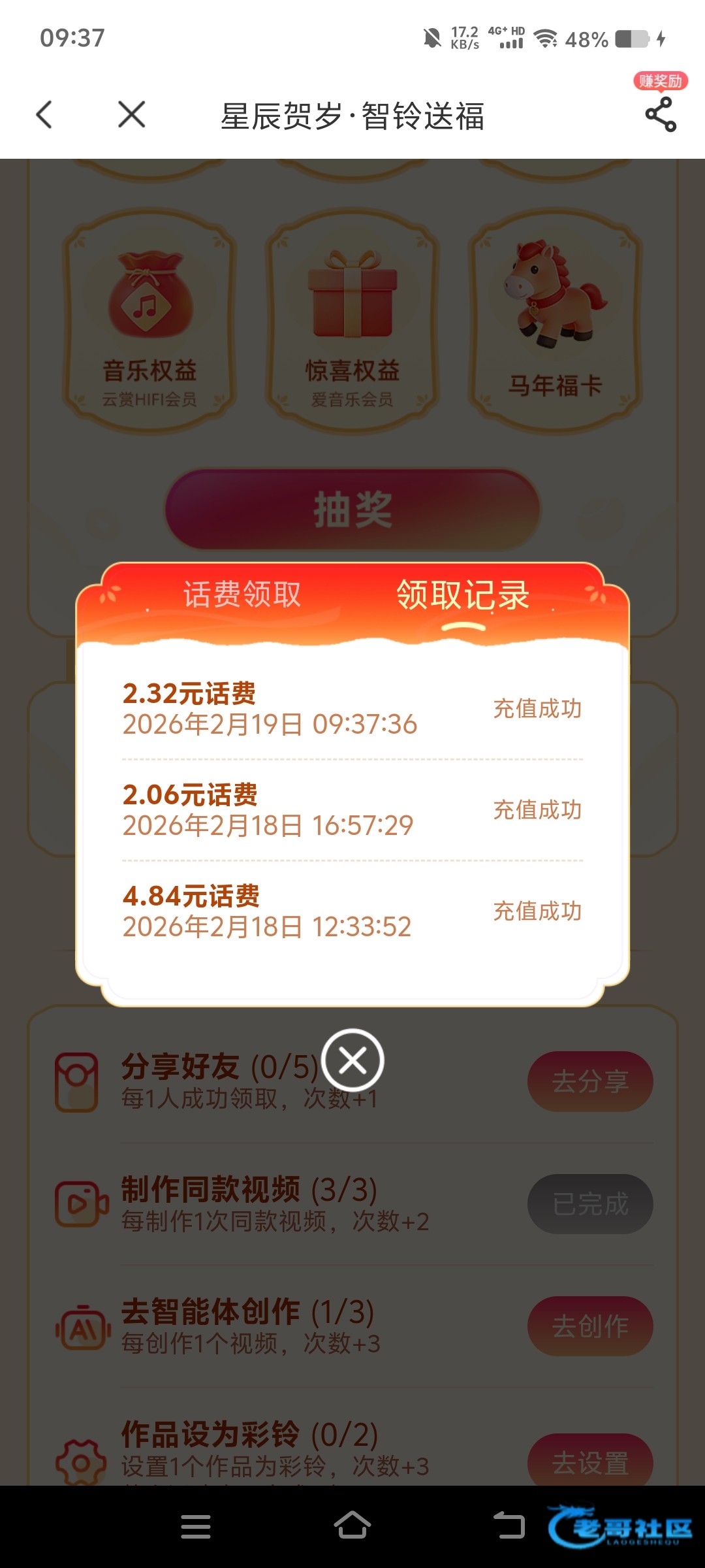 进去后免费抽5次,任务点一下就有20次,一天抽10多元话费链接https://ai.imusic.cn/h5v/fusion/2026-new-year?rpc