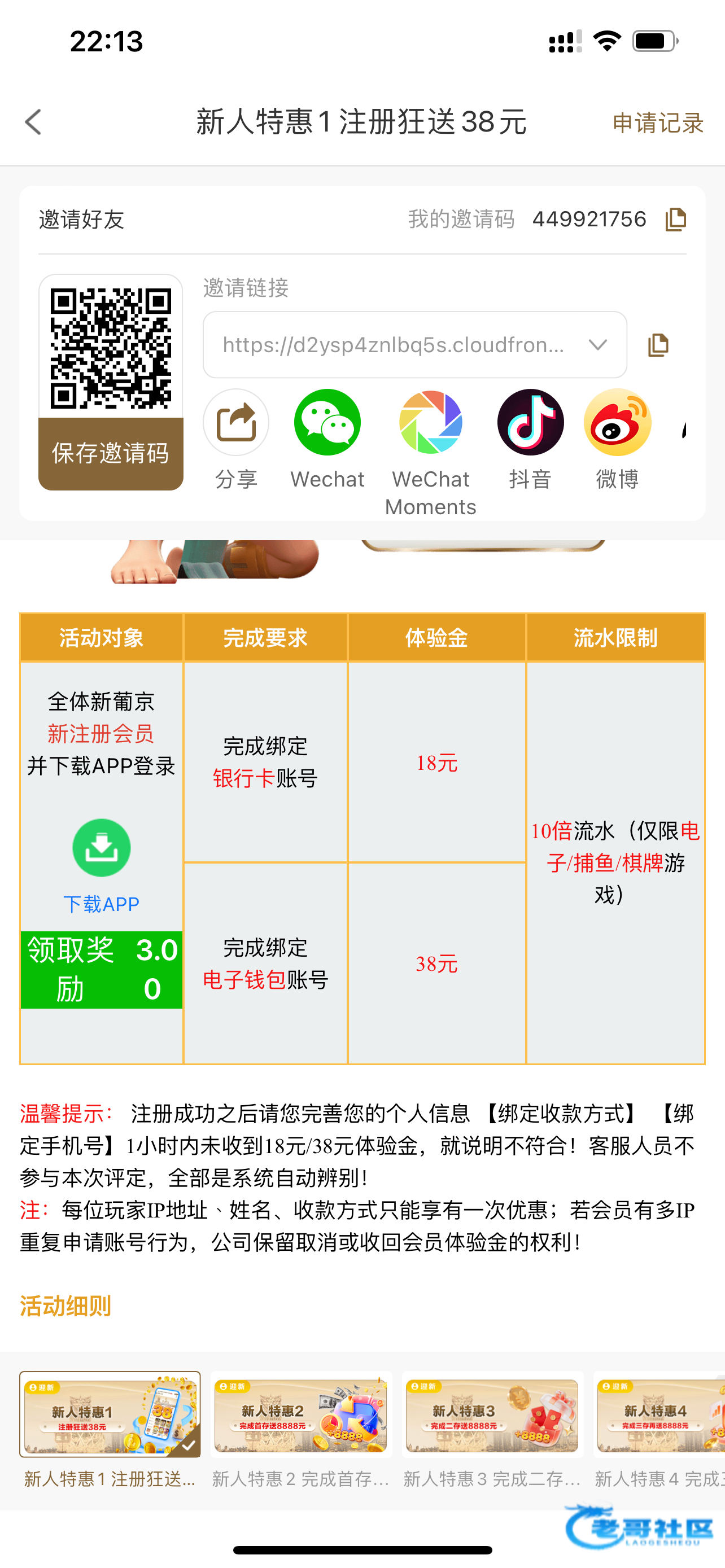 兄弟们不要去了,就算你们领取38赢了需要充值同等才可以提现,而且有可能是黑平台