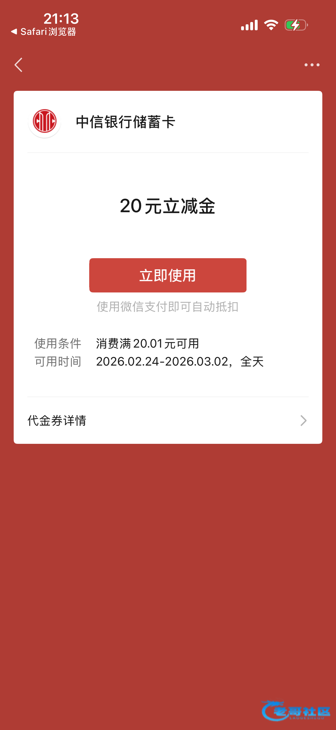 微信支付时需选择绑定的中信银行万事达人民币美元双币借记卡 (卡号为522401、528225、559166开头),方可抵扣微信立减金。