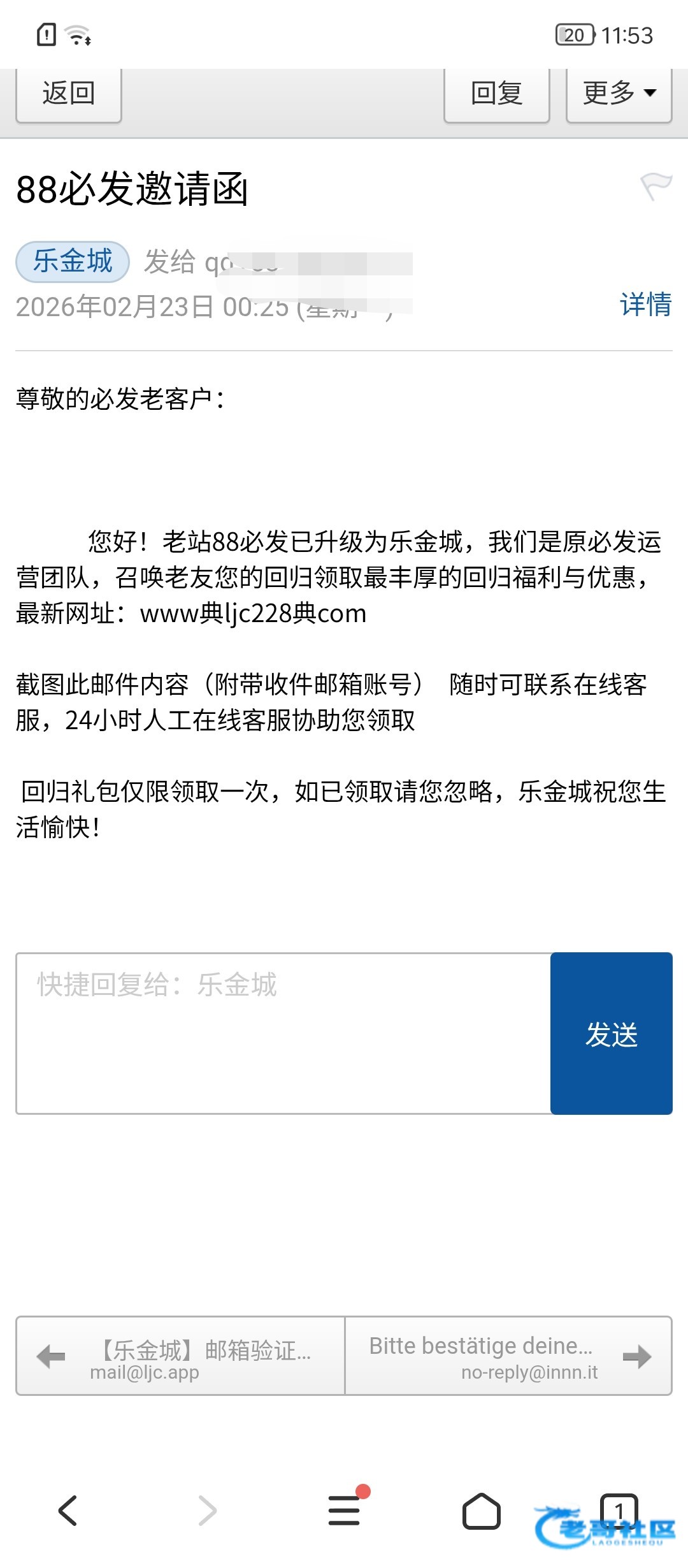乐金城发邮件送了我188 说是之前的88必发升级,有的可以看看能不能出我也不知道,还没打链接www.ljc228.com