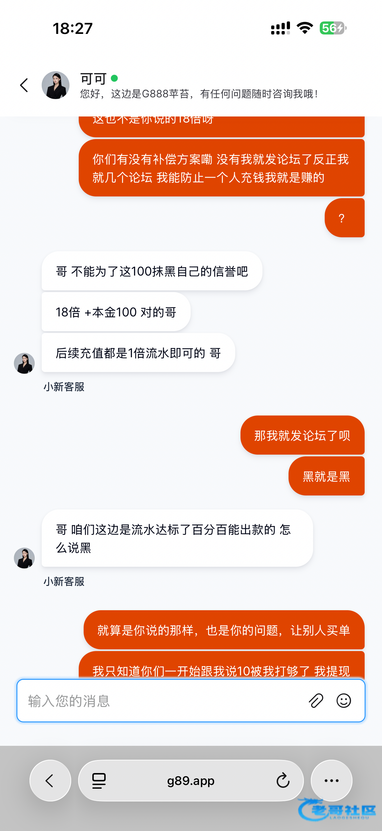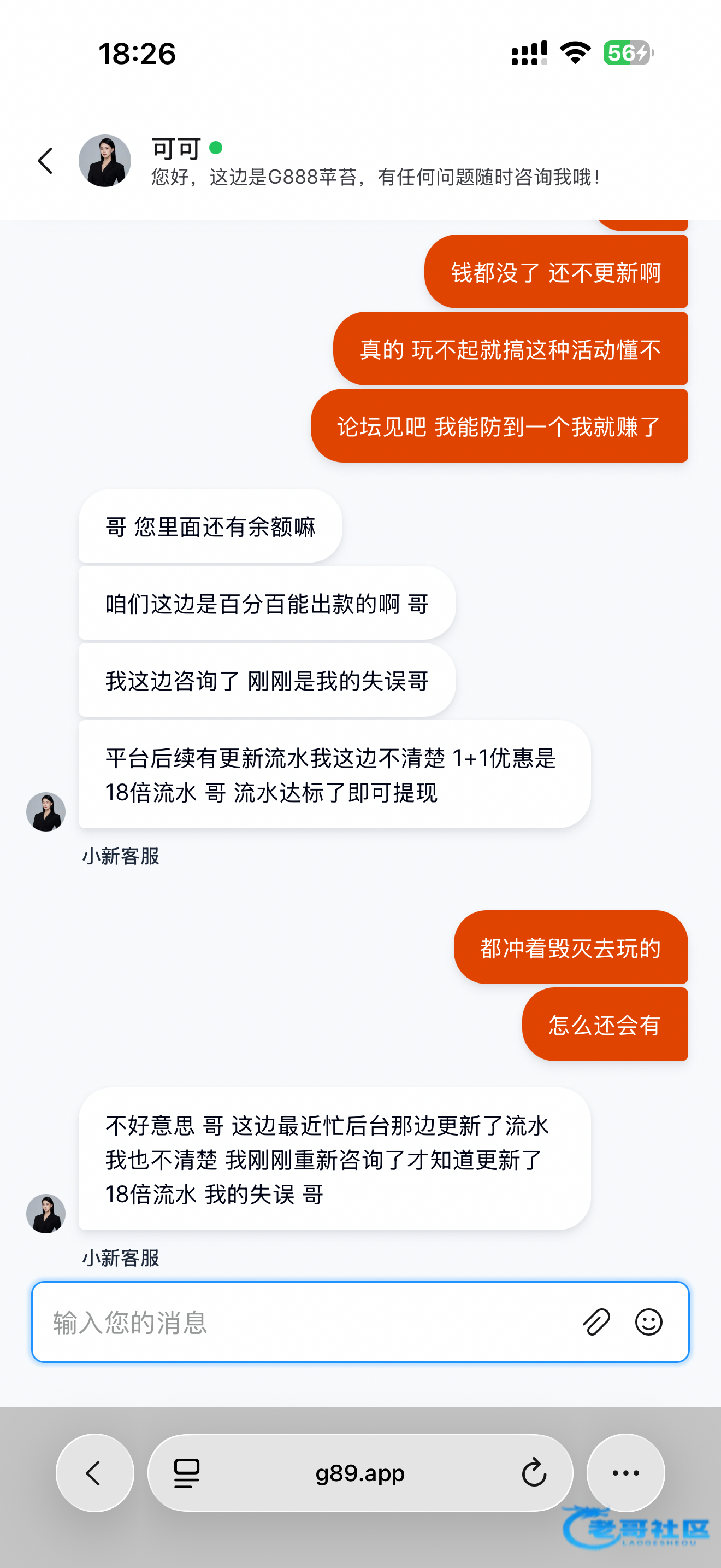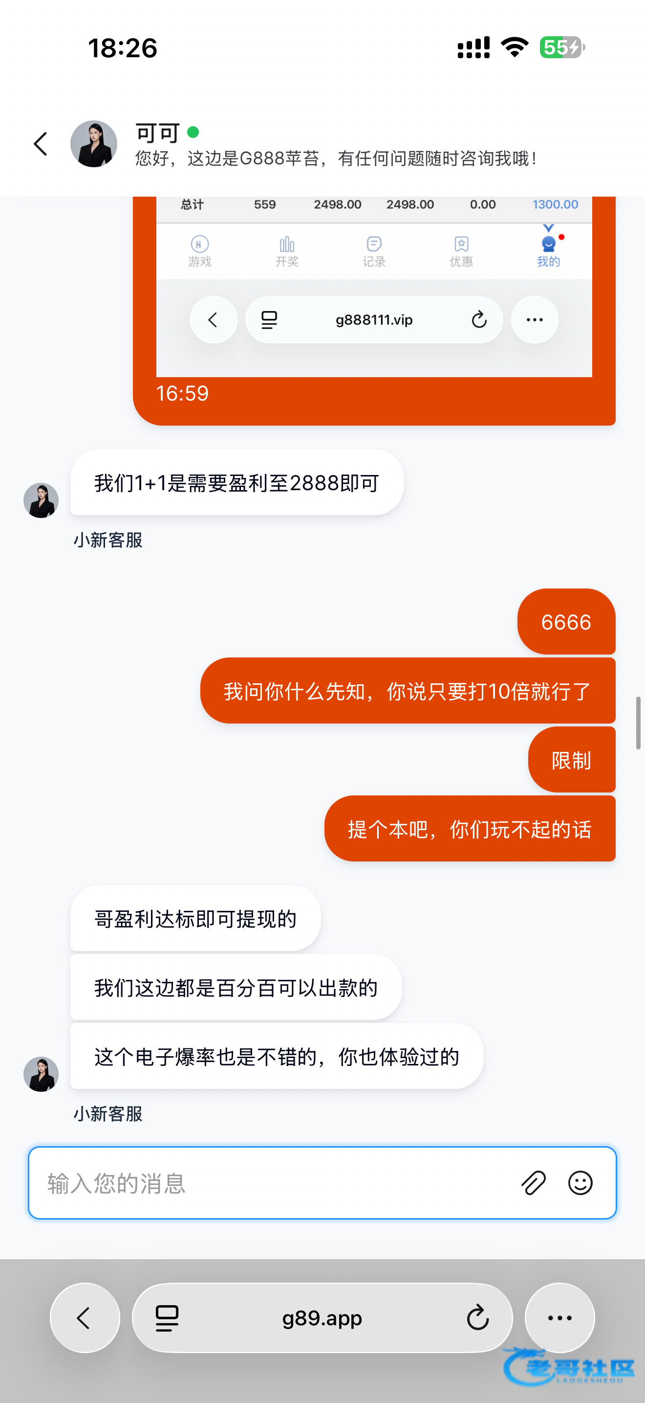 参加了他们个 1➕1的活动 打十倍流水就能提现 打到了1500流水也够了 想提现的时候发现流水居然还要1900 然后我就去问客服 他说必须要盈利到2888才能提现 妈的就觉得这是黑我然后就去毁灭式的乱打 打完后越想越气就去骂他们平台 狗逼客服突然说是因为他的失误其实只要打18倍流水就能提现 但我也不知道这句话是不是真的可能是因为我说我要发论坛吧所以她才这样的说辞吧 我随便你们骂我确实贪便宜了