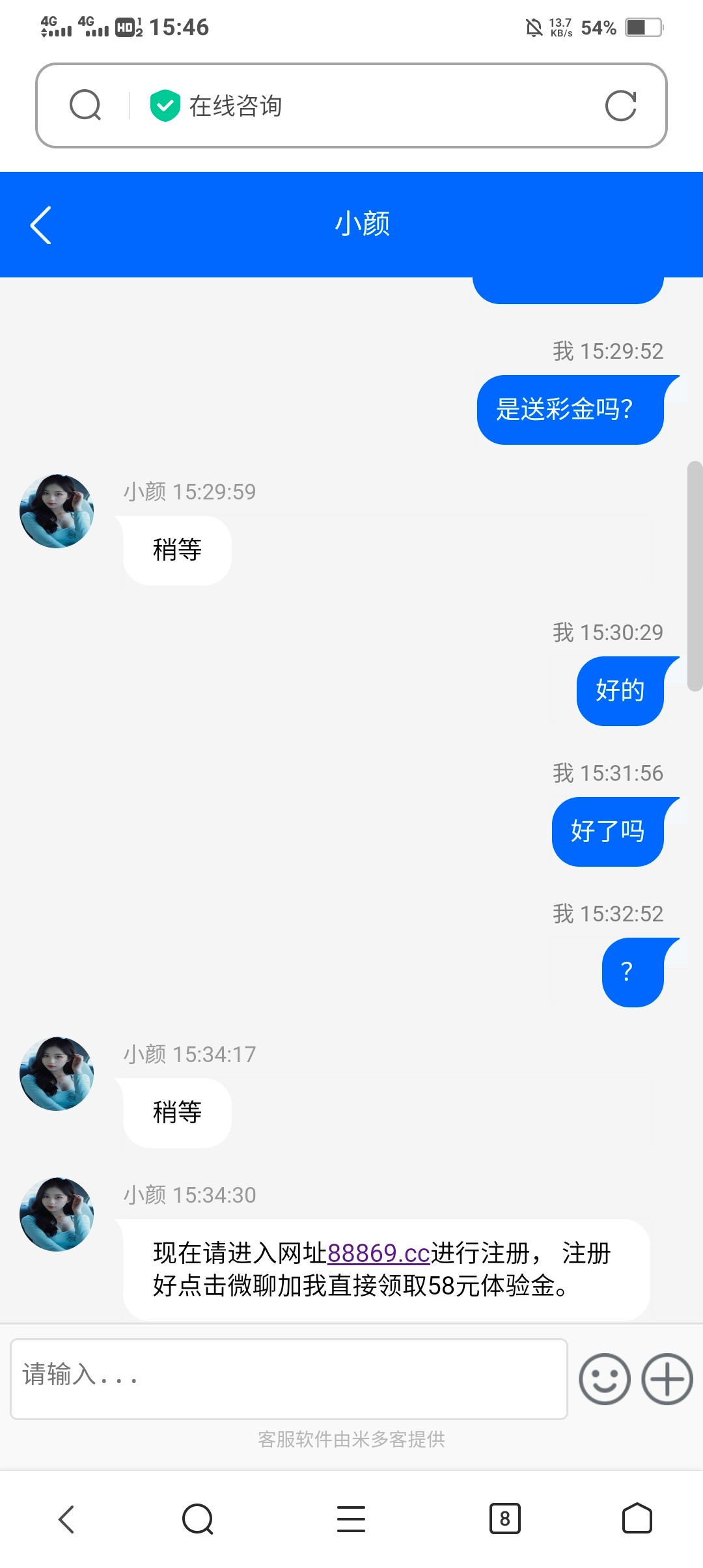 我是收到了短信注册联系微聊客服领取了58彩金 注册邀请码1881 多多宣传支持老哥社区lg00.cc