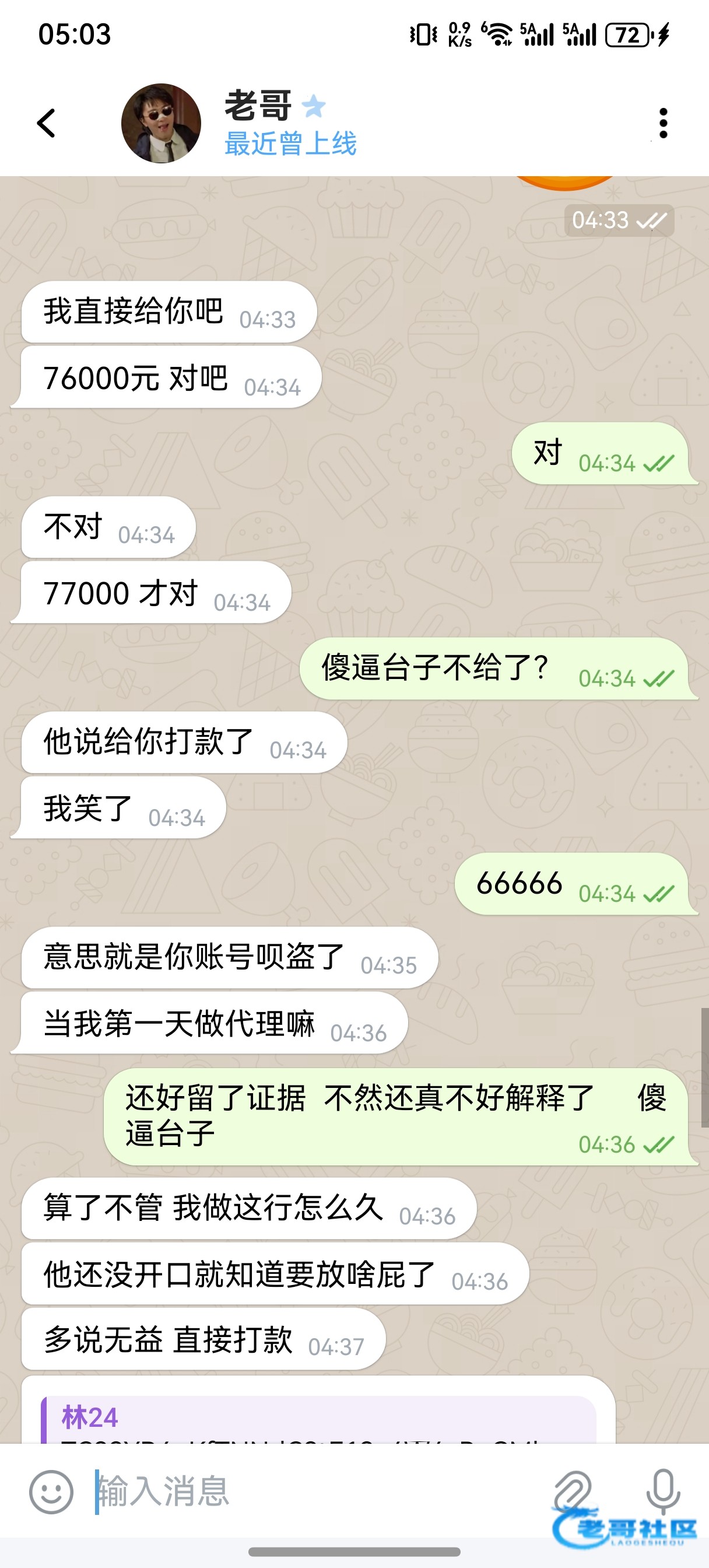 给玩家赔付后和平台扯皮到大约早上7:00 盘口老板已经把款补给我了,说是下面的人在搞事情。早上老板也打电话解释了,钱也补给我了,理由是这几天他都不在办公室,才会出现这事。