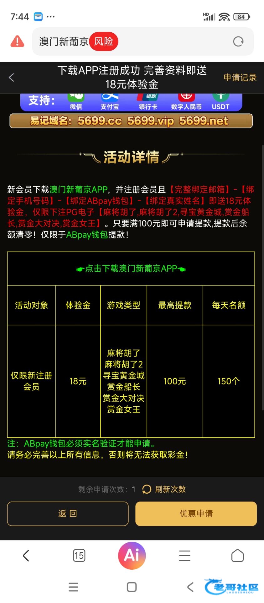 送18或者58下载app注册绑定手机号找客服电话特邀碰瓷58,没申请到可以去申请下载app,绑定abpay钱包领取18彩金,每天150个名额,下面那个18仔细看好申请条件最低最高100提现。网站 5699.cc