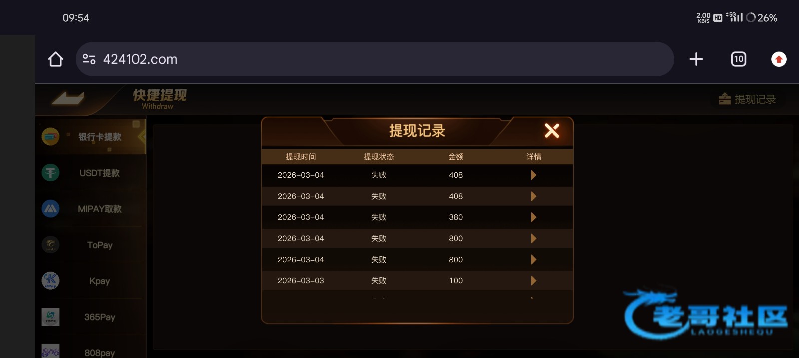 凌晨又想赢回来,充了100打到800,提款半小时一直不到,一会失败退回罚15倍流水,打了一晚上,早上又打,打完剩408提款又罚15倍,充值玩的彩金一分都没领,避雷黑平台jj棋牌,这傻逼台子就喜欢晚上打电话,要不是身上没钱第一次罚流水就直接不要了,没想到是无限罚流水,一会准备去咖聊骂那个专员了,老哥们注意这个黑台吧