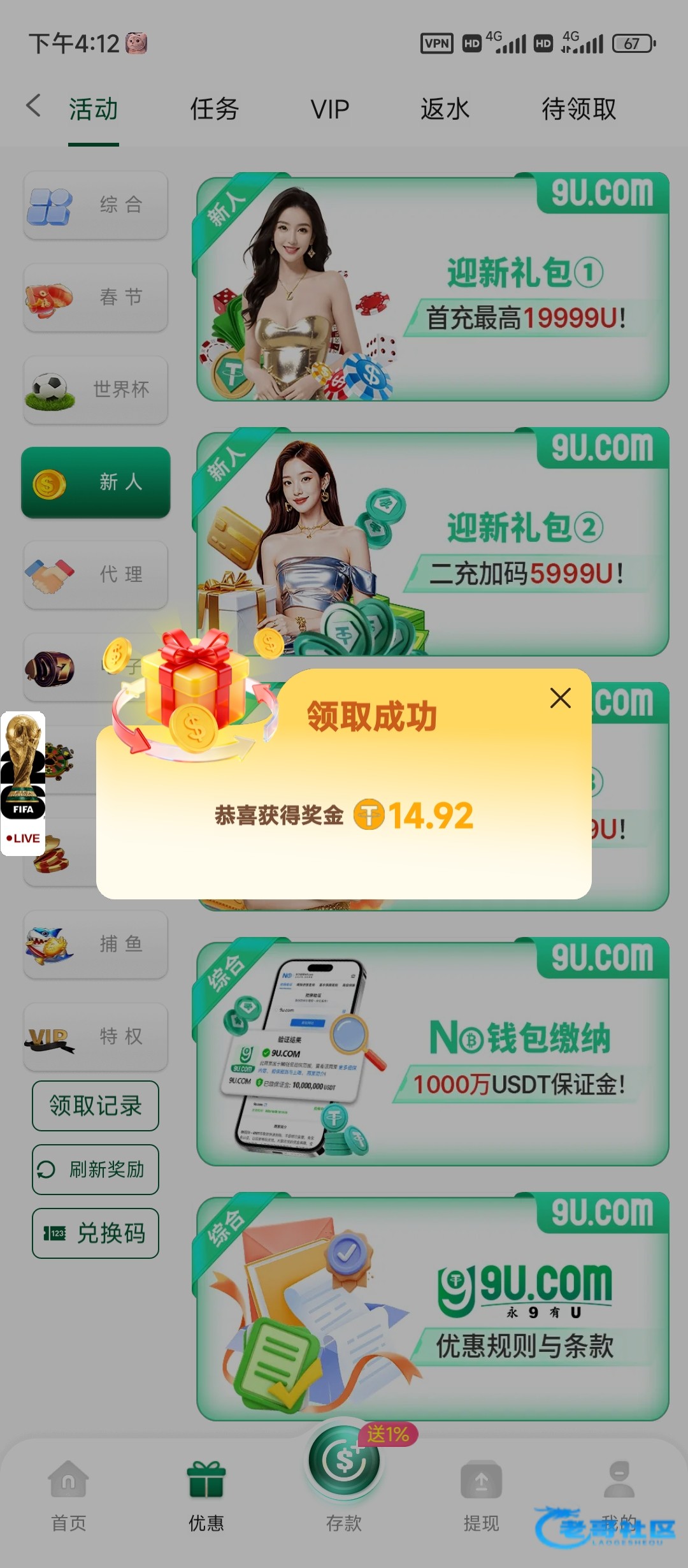 限前1000名,最近90天充值100U以上的可以领取,仅限电子6倍水,最少领5u,兑换码9uFFF,注意大小写,网址9u.com