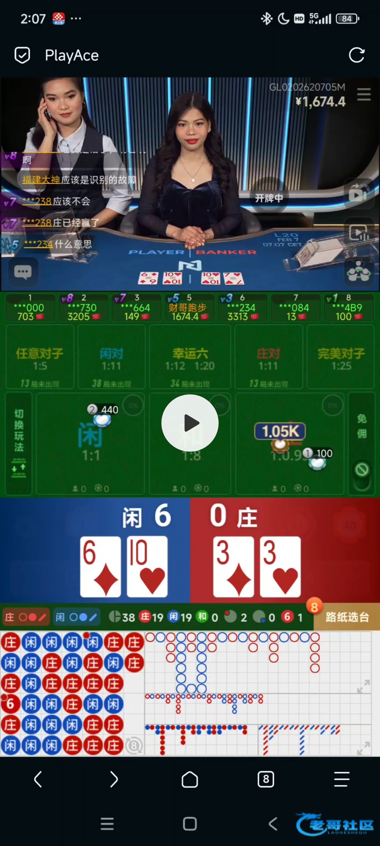 通常来说桌面和显示屏牌不一样这一刻是马上暂停的来经理,上次我哈一千庄,闲是公加6,庄是公加7,这牌是叉烧牌结果我马上换台结果一直不派彩,后面找到哪台面显示屏庄是一对6最终,显示公6来了一个经理,最终还是桌面为准