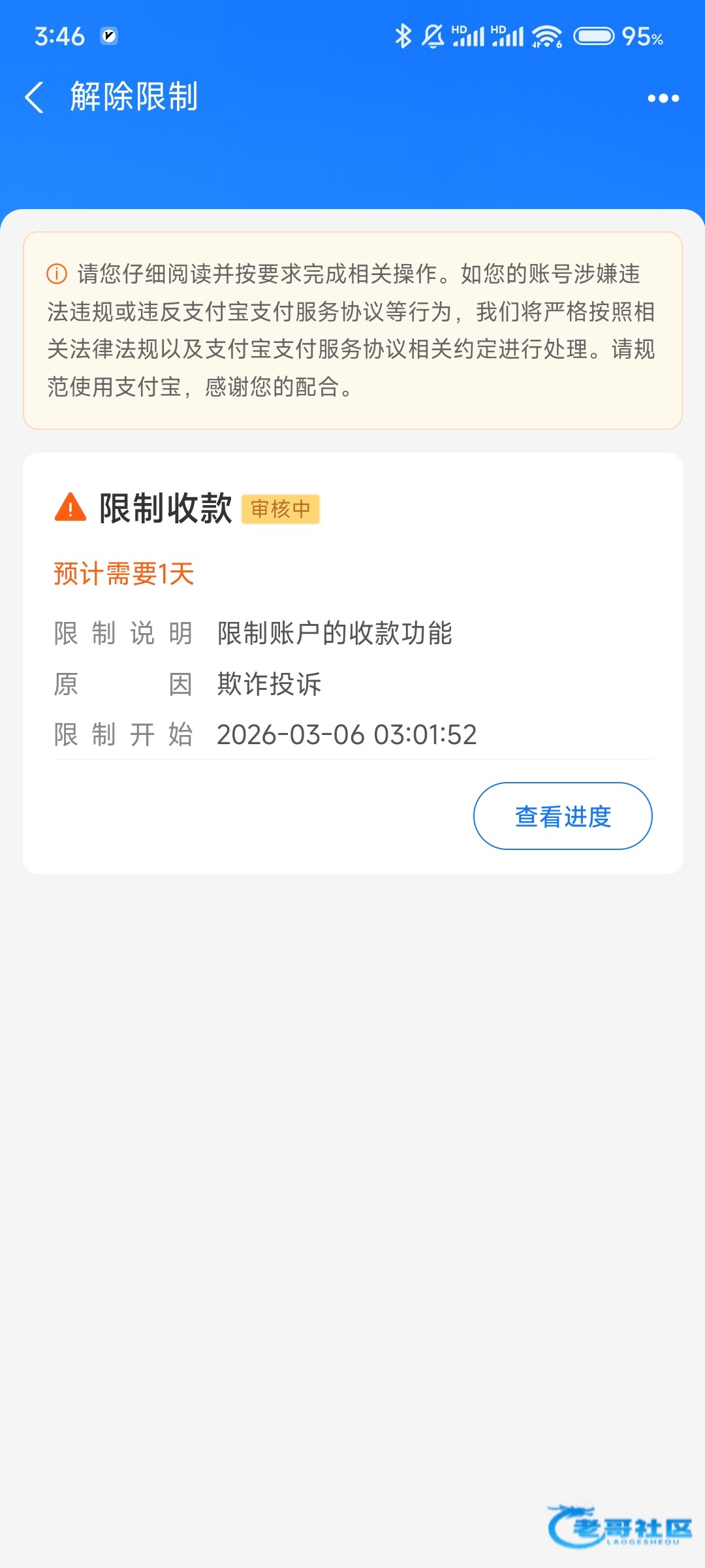 在这说一下,那个1天不是封的1天,是我申诉支付宝审核时间是1天,他不显示什么时候解封,另外的方案就是退款解封,我现在这个是申述需要1天的审核时间