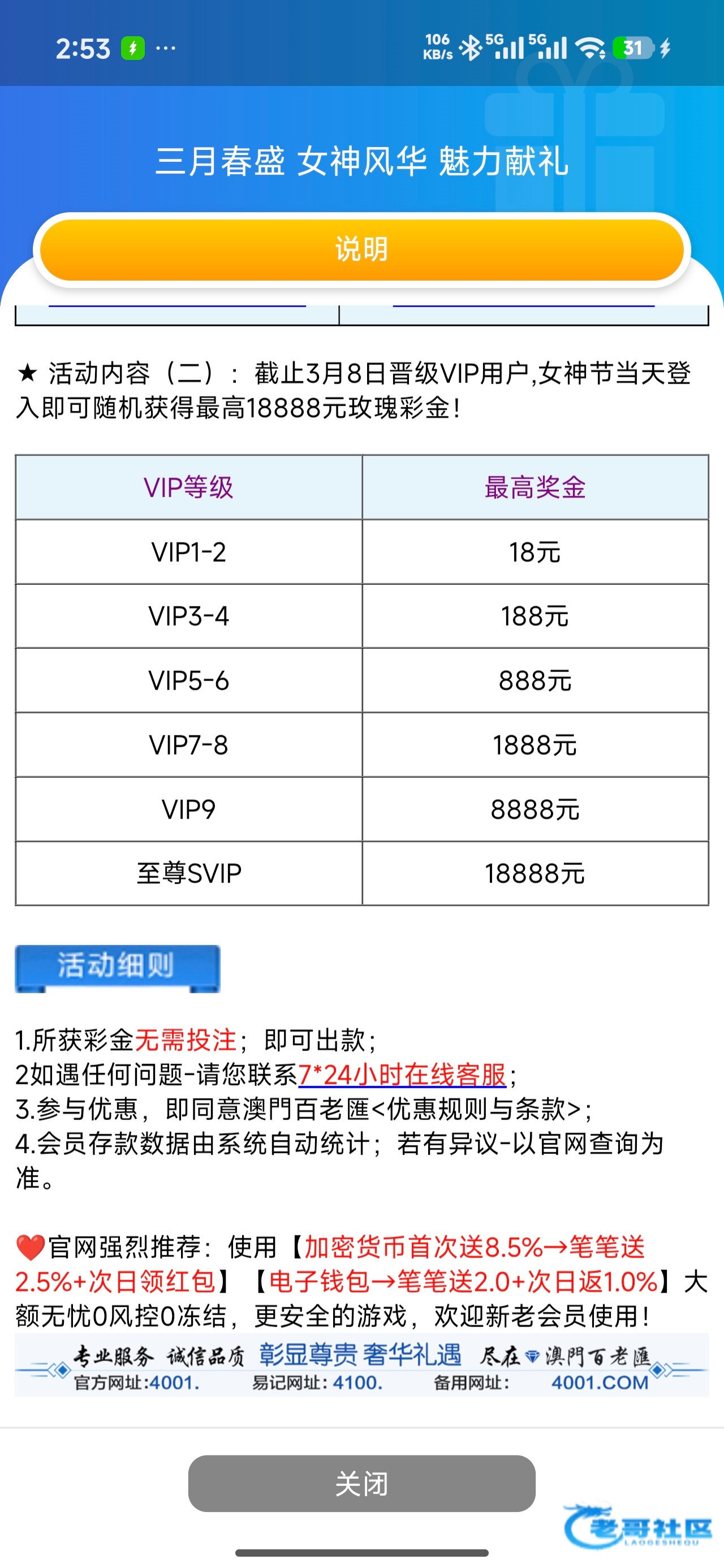 3.8号中午12点登录一下就有 有等级的记得登录一下 我vip3估计保底18 客服说的是随机赠送最高彩金如图 网址4001.com