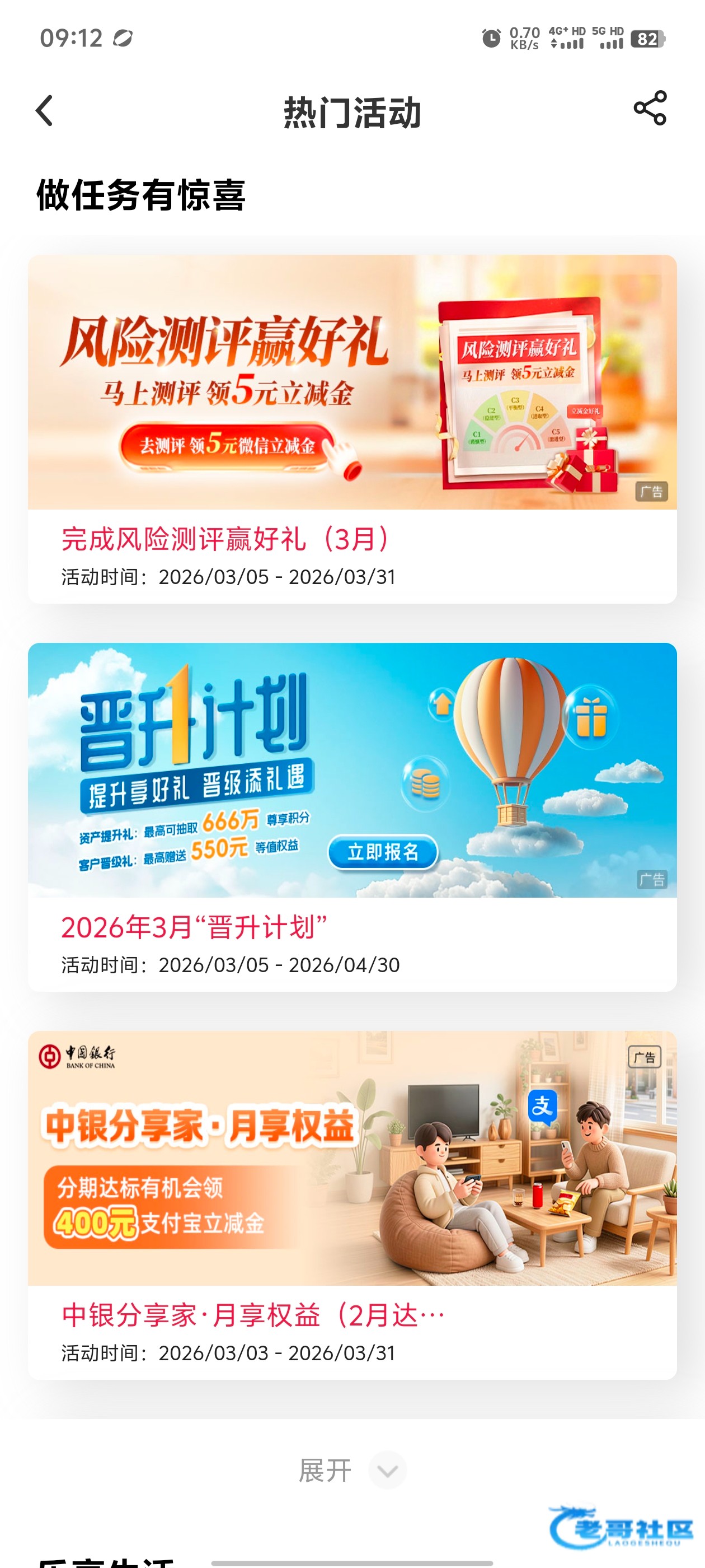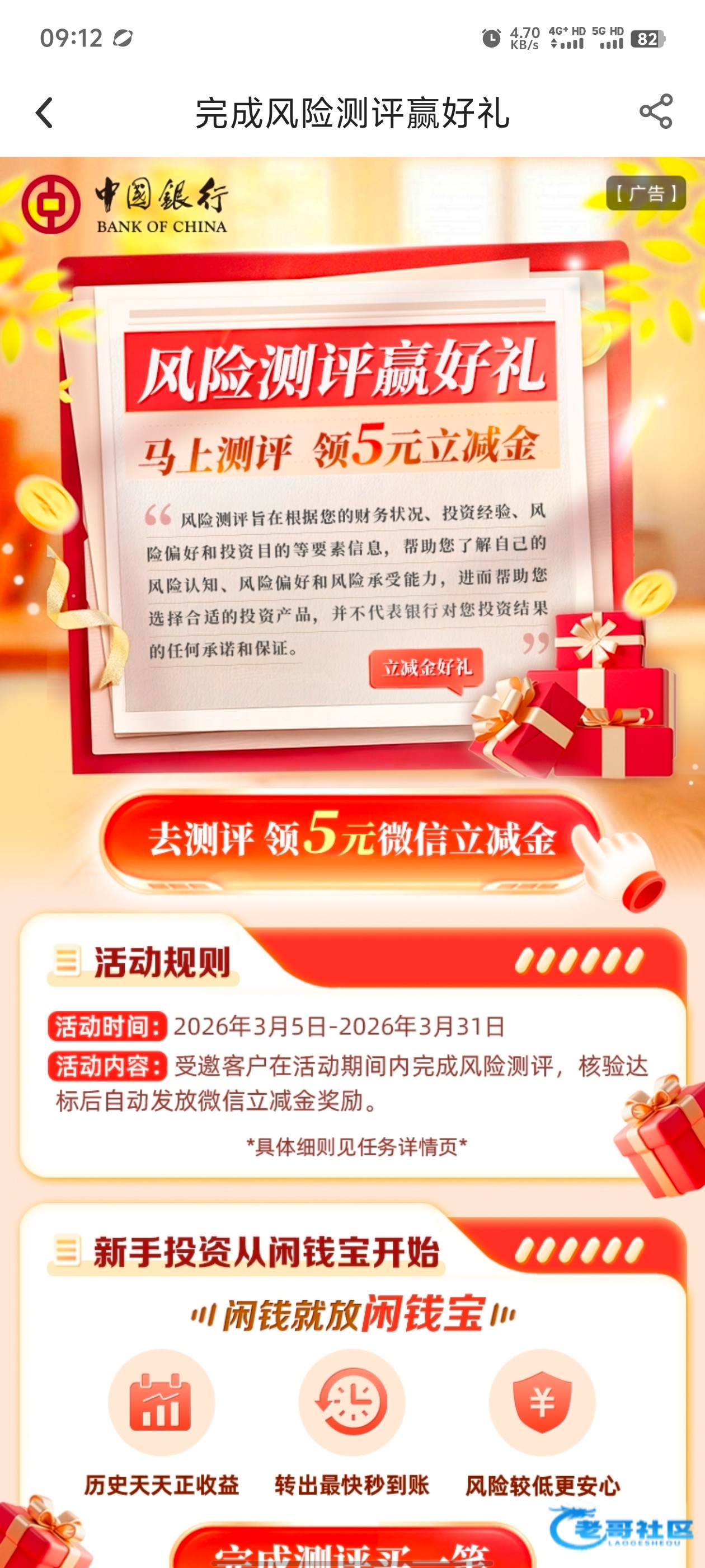在中国银行app活动页面,完成评测就送5块微信立减金