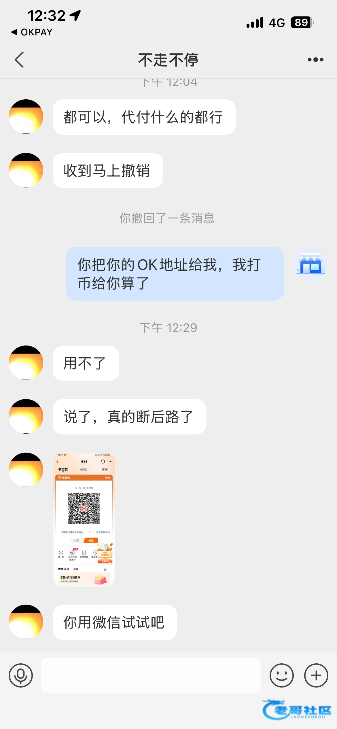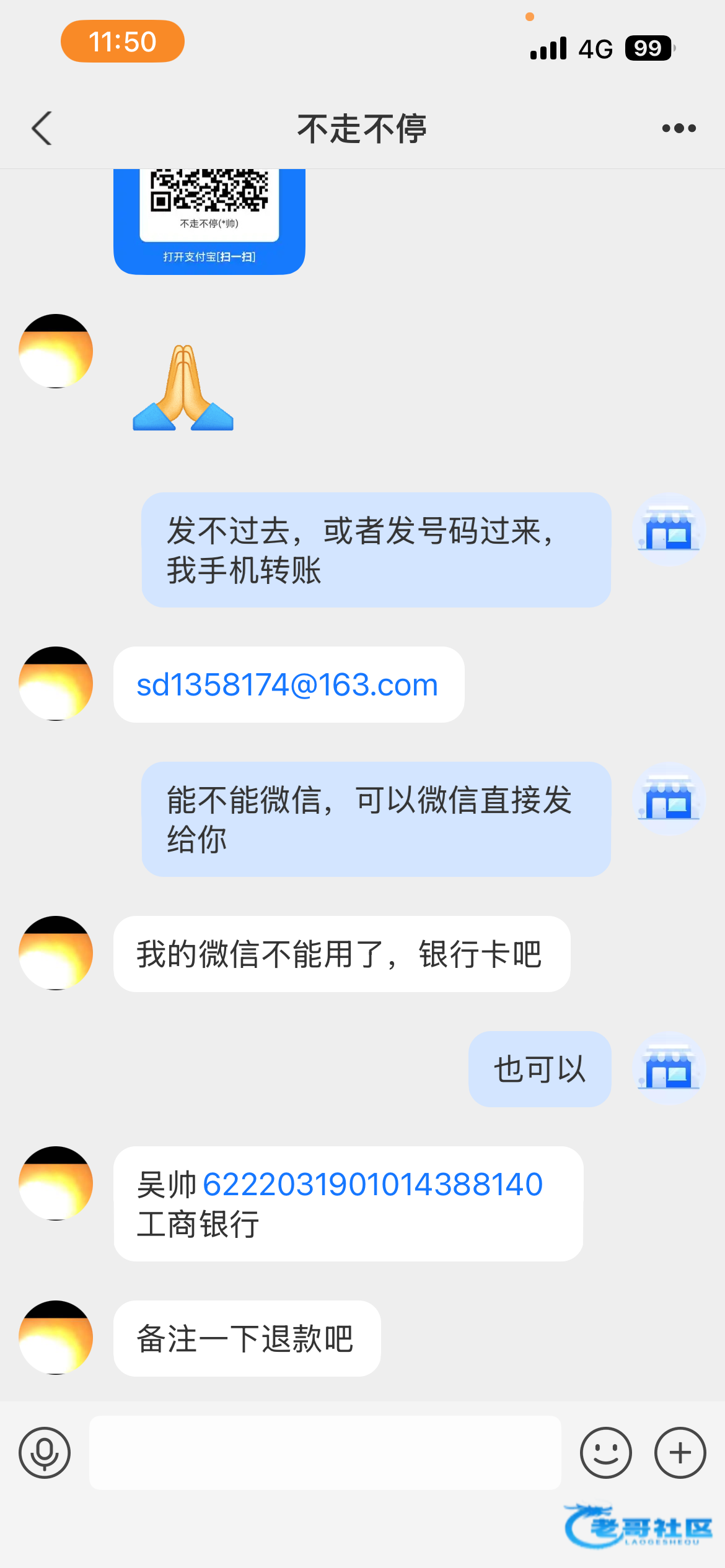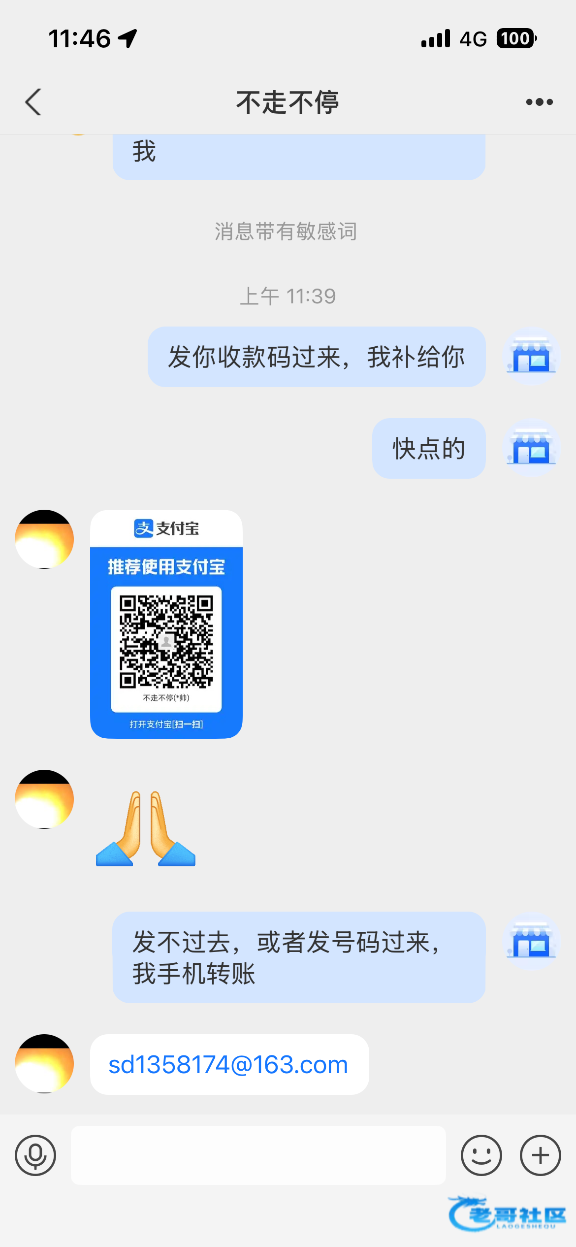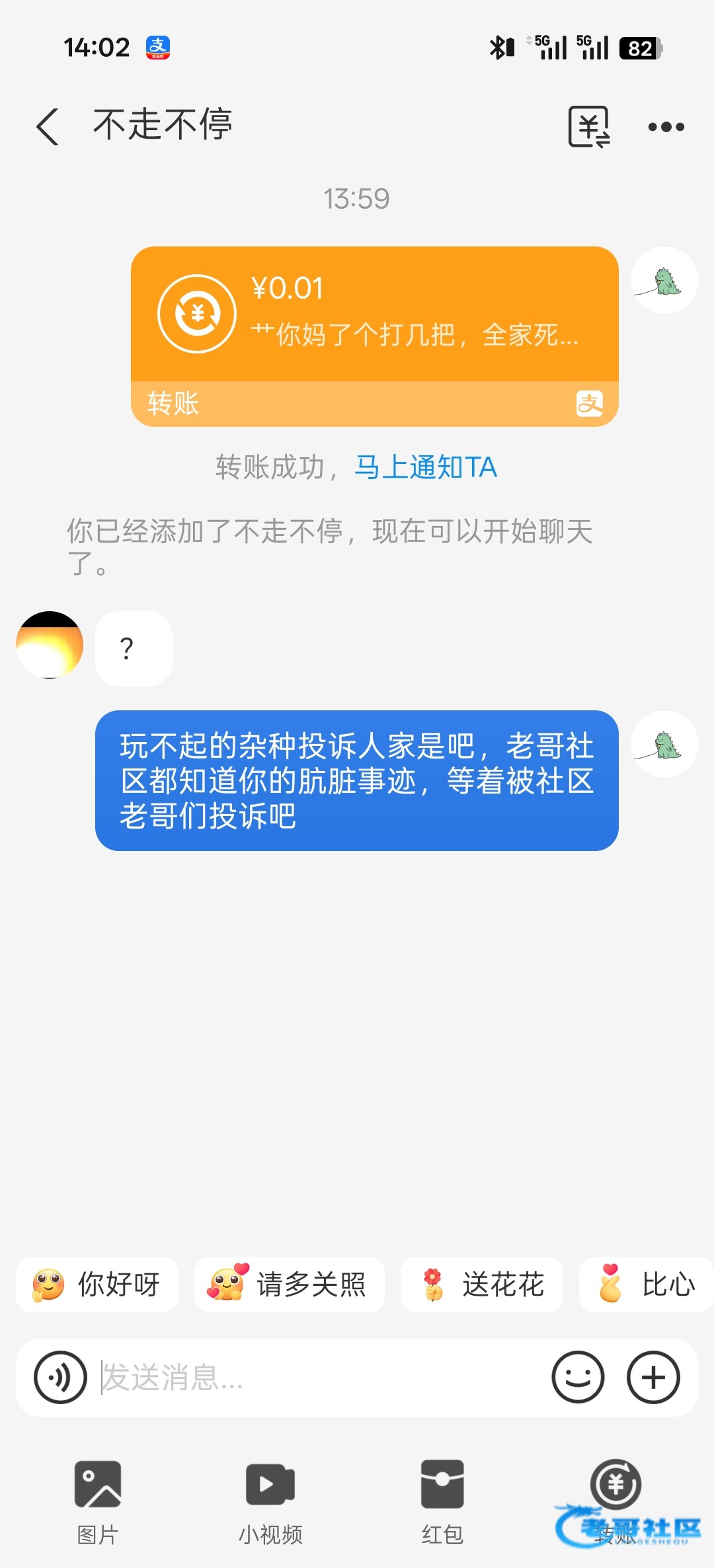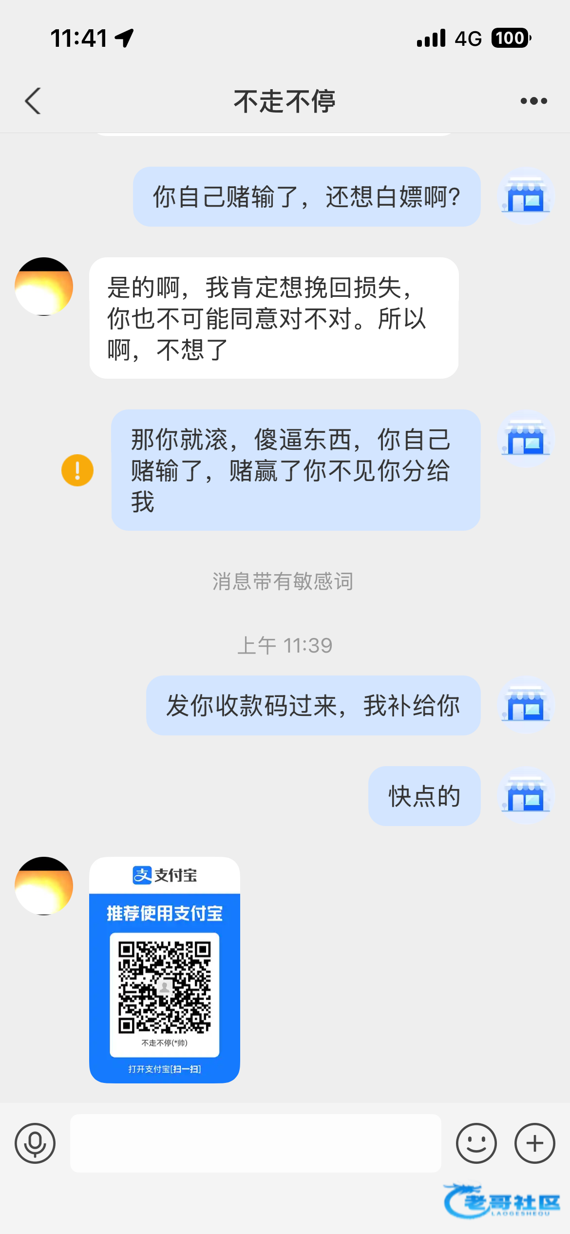 你可以套路他,说发二维码来转,然后老哥们付款0. 01投诉,他也遭殃