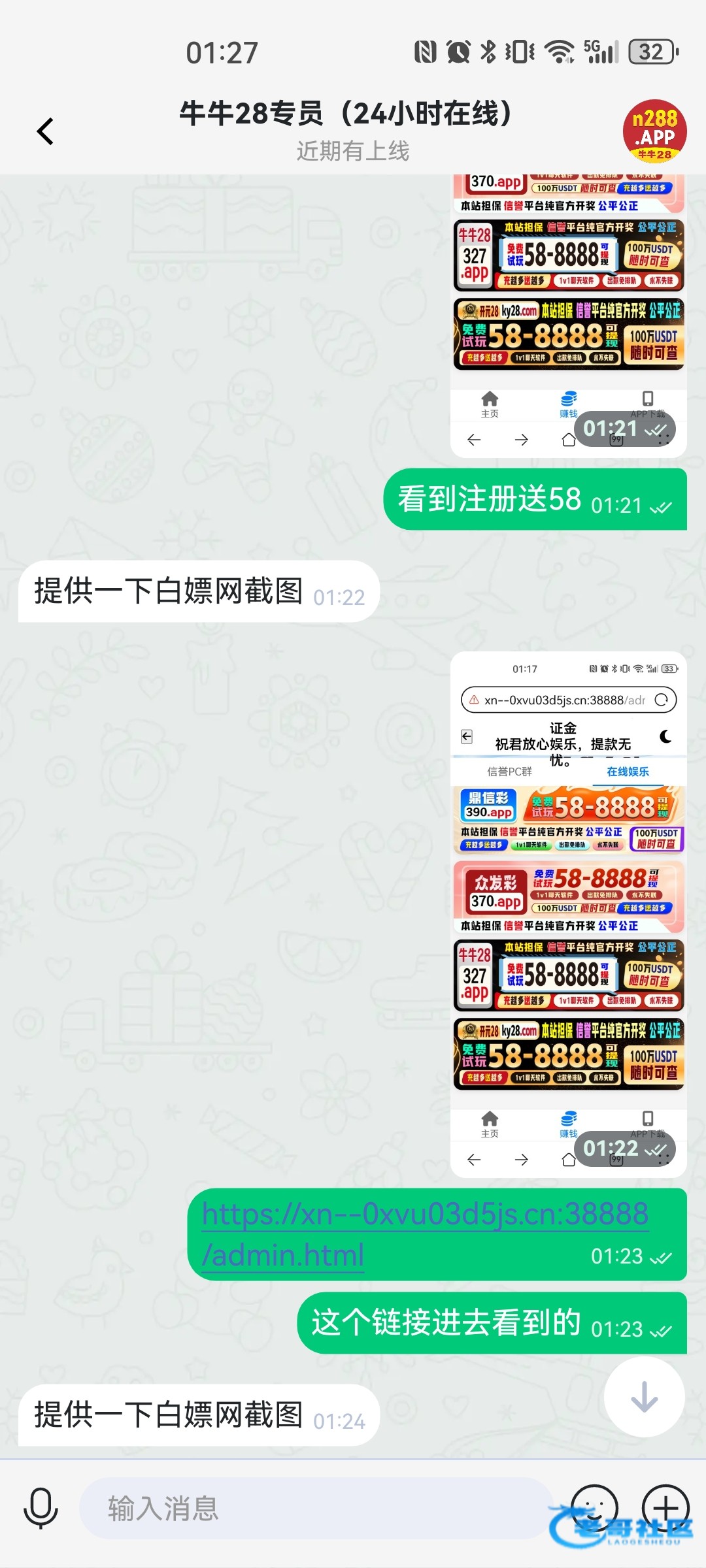https://麦格菲.cn:38888/admin.html 从这里进去找到牛牛28注册等电话送 我本来是想去批U的 没想到过一会给我来电话送58了 白嫖一百出来