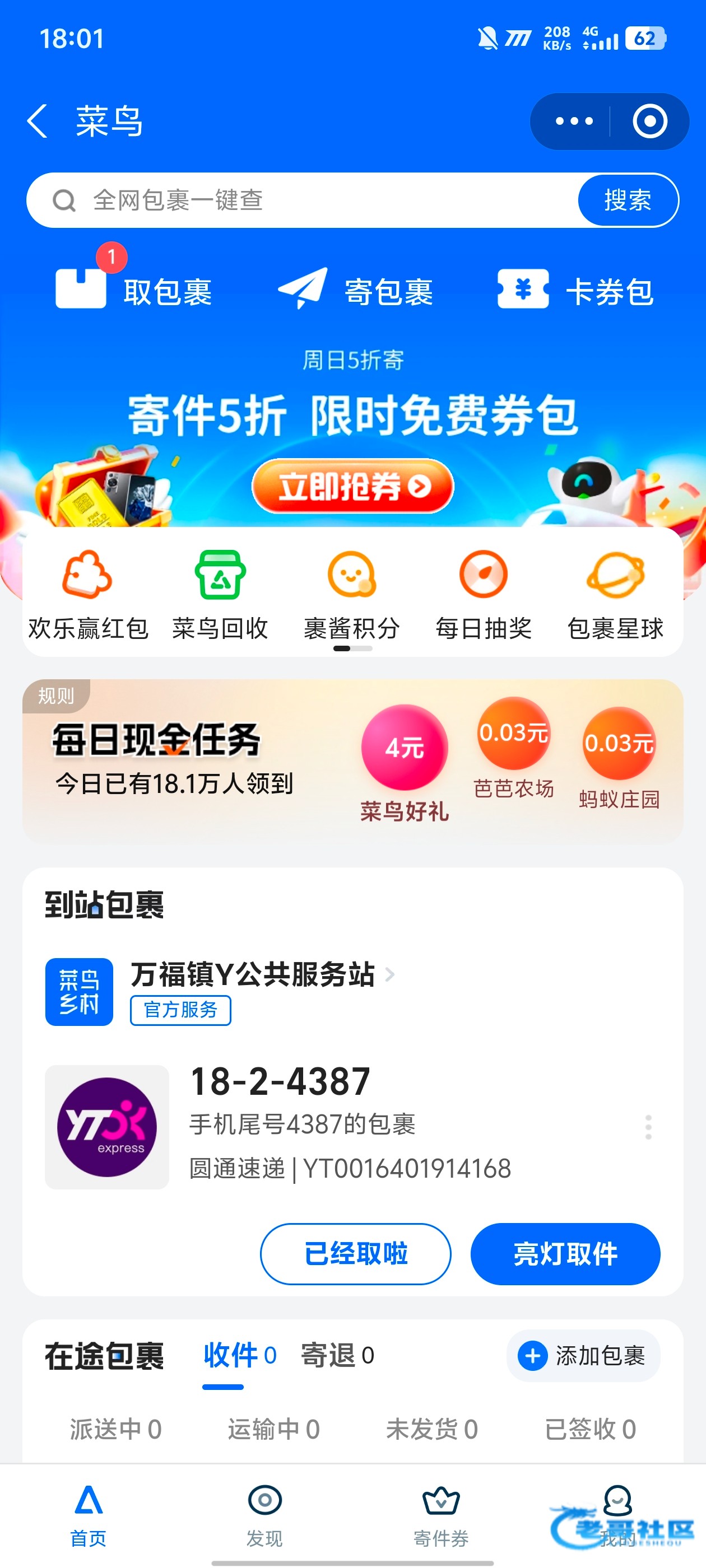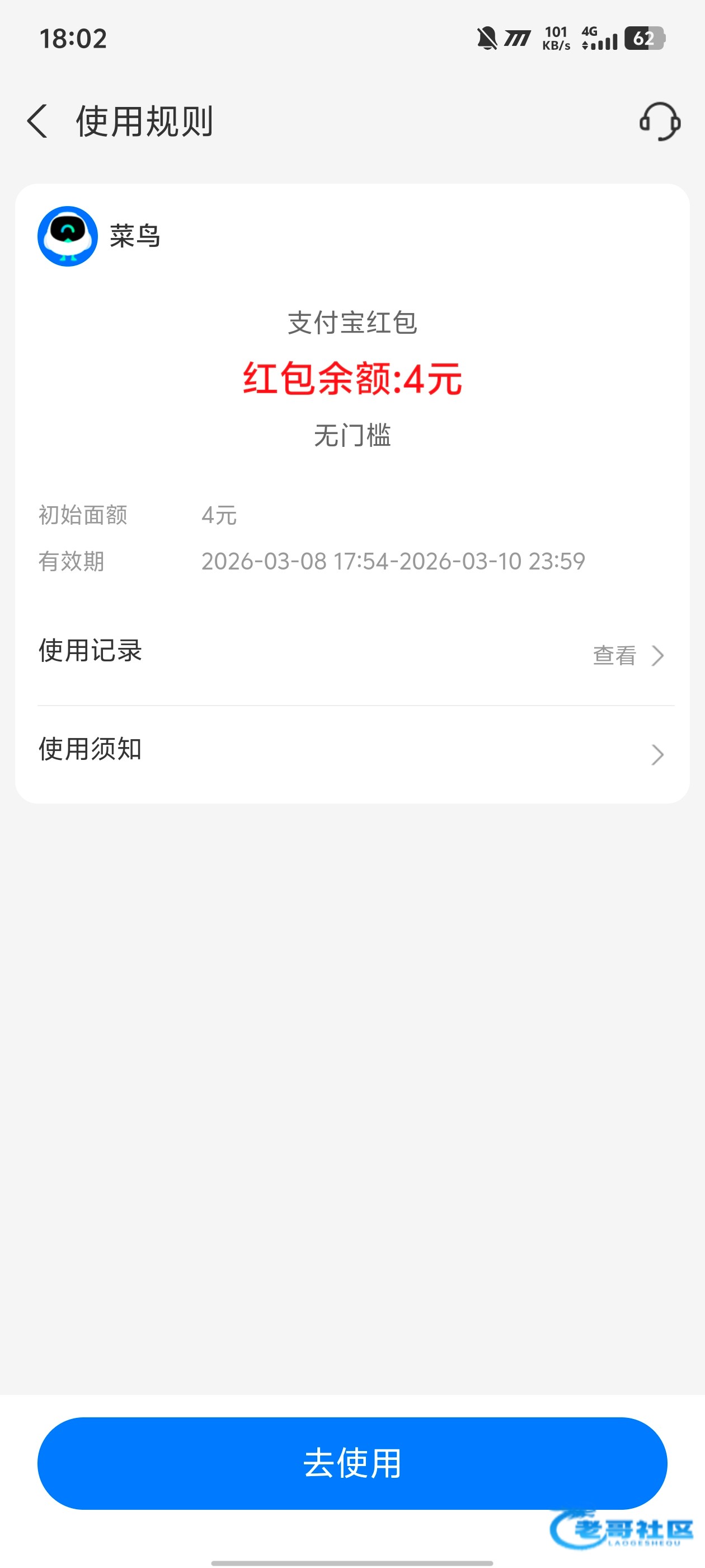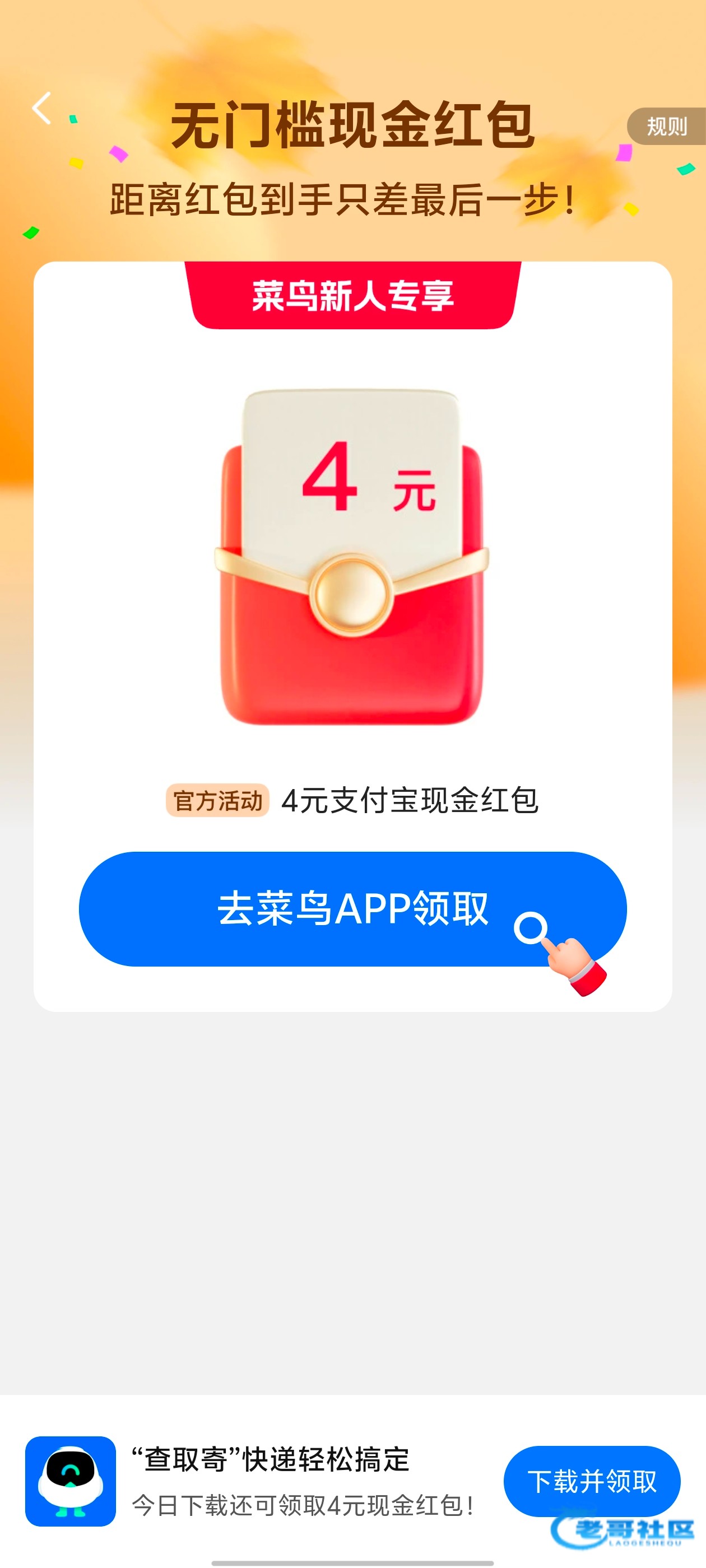 支付宝搜索菜鸟,点那个4块钱,下载菜鸟登录一下,必得4块钱支付宝红包,多号多撸,三个支付宝就是12,点那个菜鸟好礼4元点那个任务现金