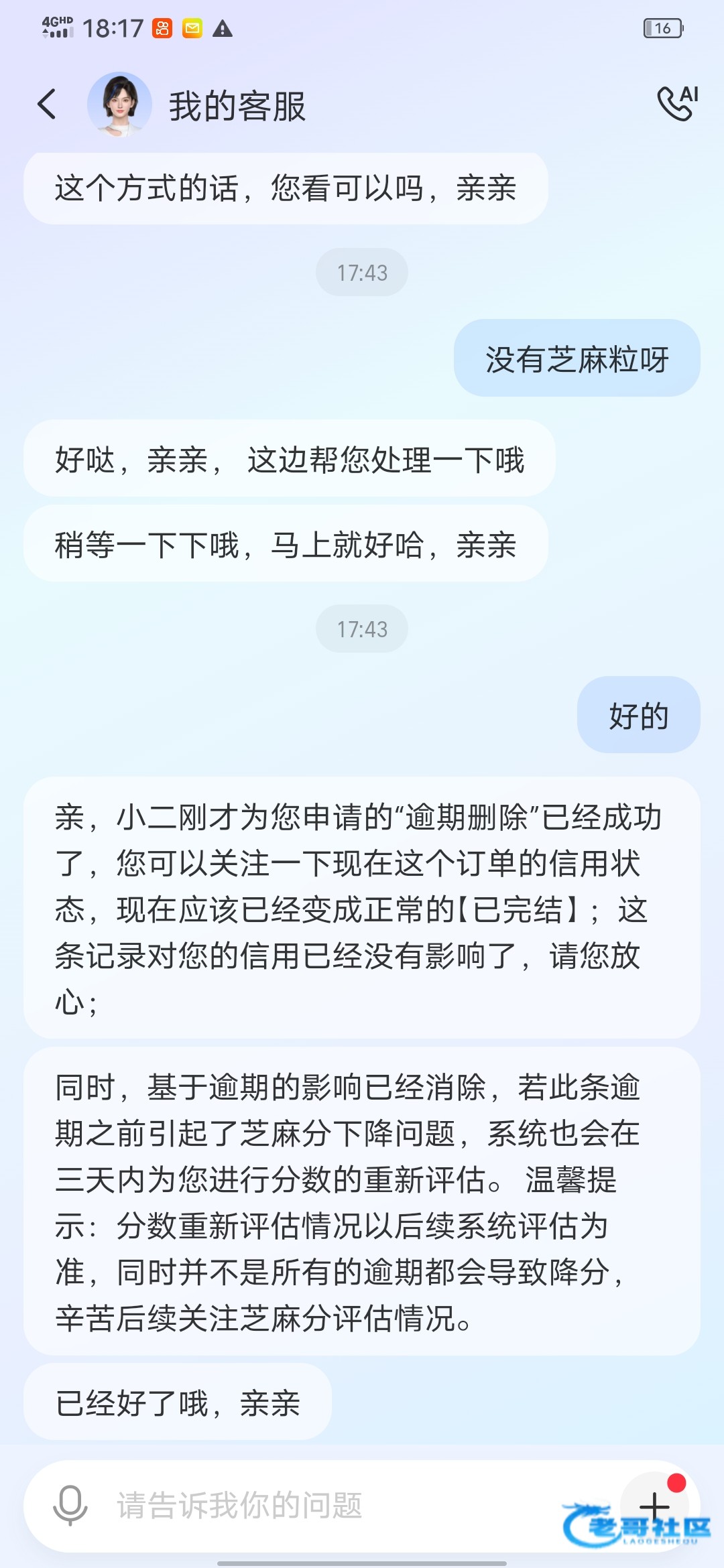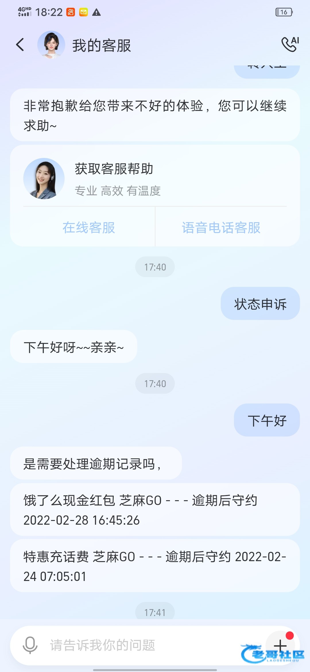 找到你那个逾期记录,下面有的我的客服入口,点进去,直接转人工,输入信用状态申诉,客服会问你原因,理由合理就行,客服不管的