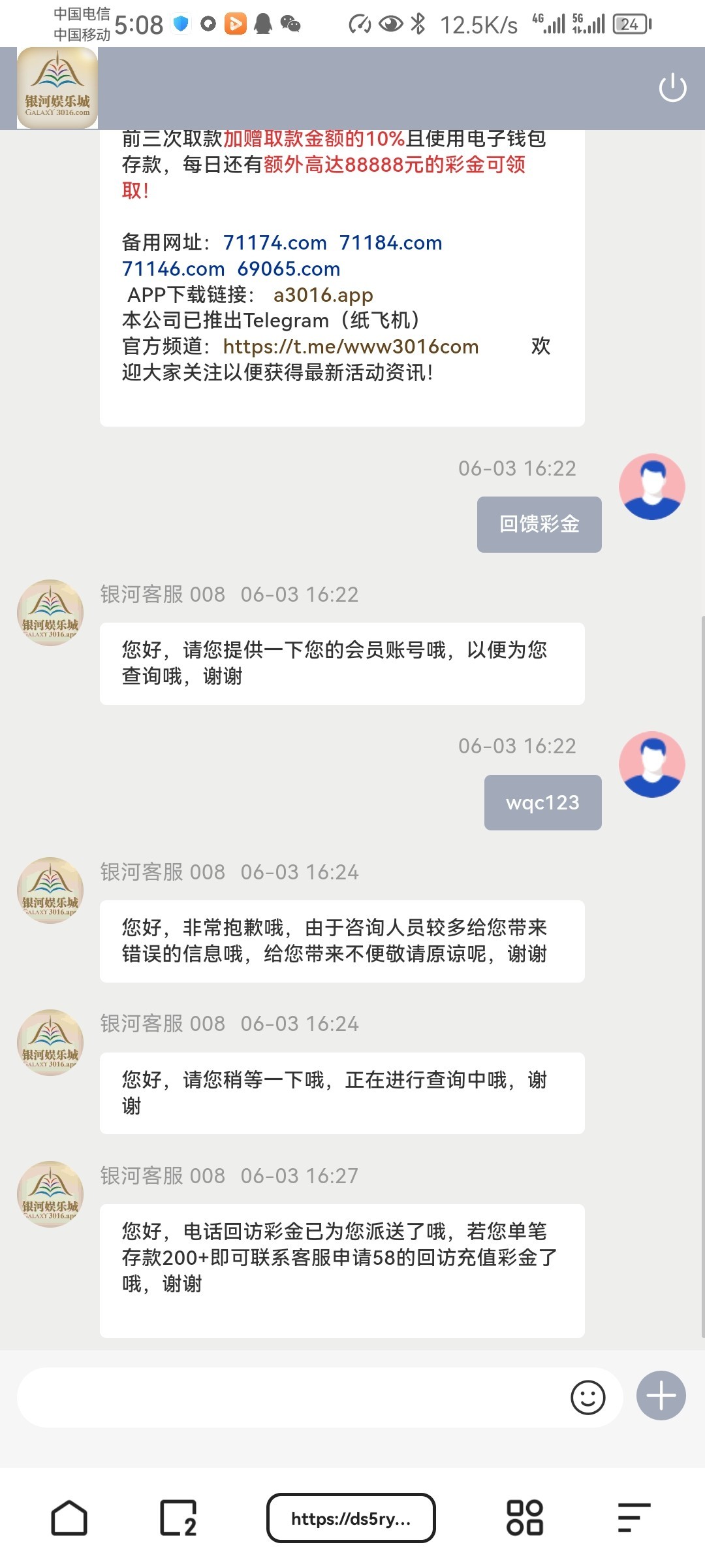 找客服说回访彩金就行 充值过的基本都有 我只出了100