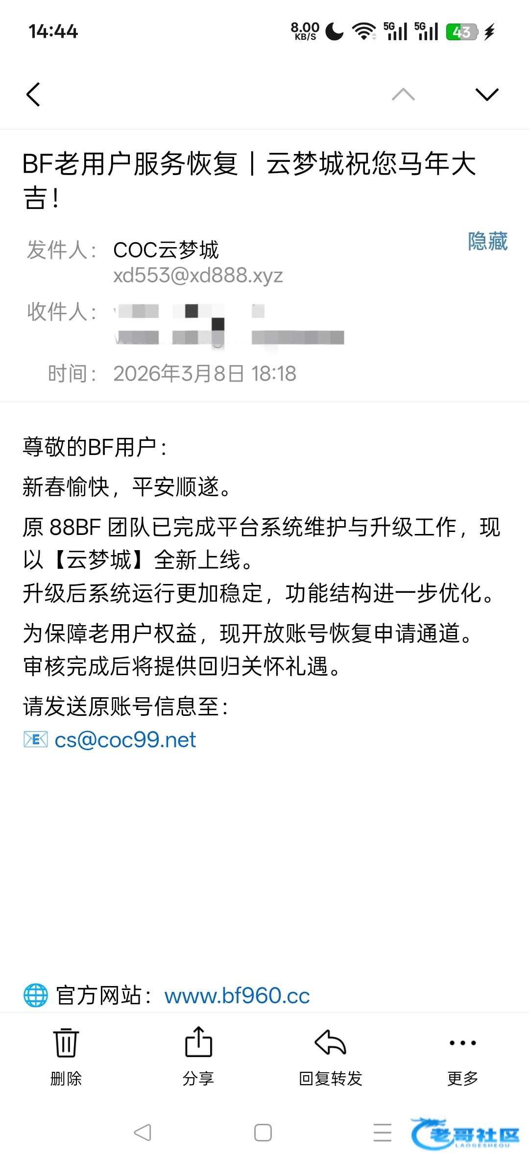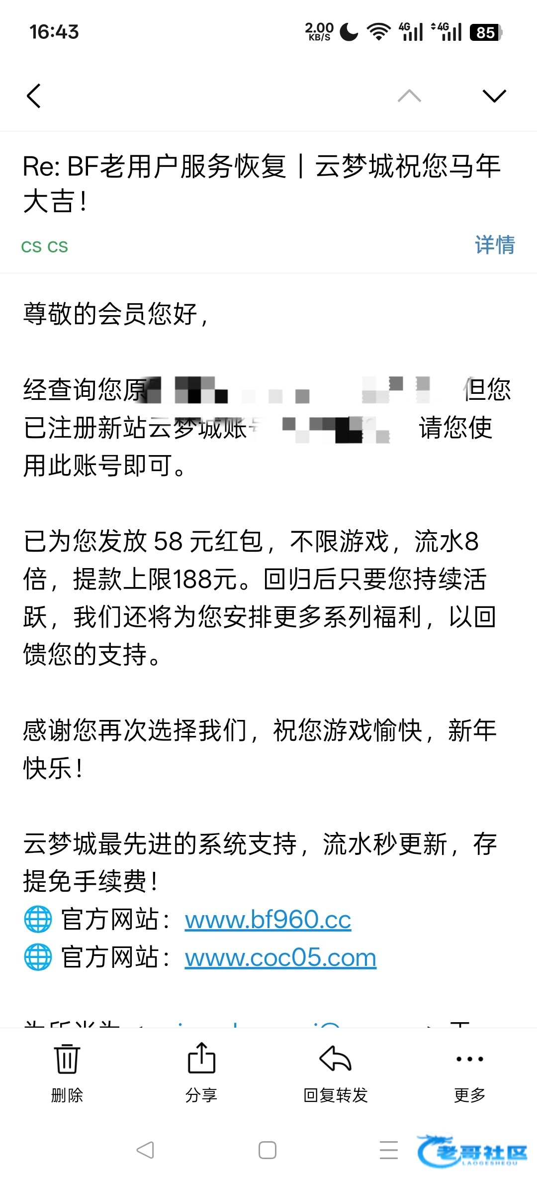 收到个邮件,云梦城发的,说什么必发88老会员,回复了下送了58(没充过值)