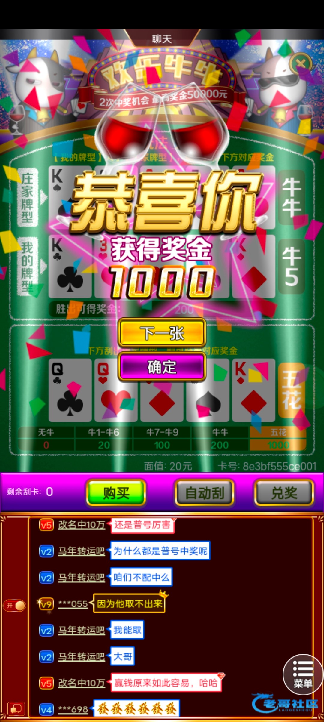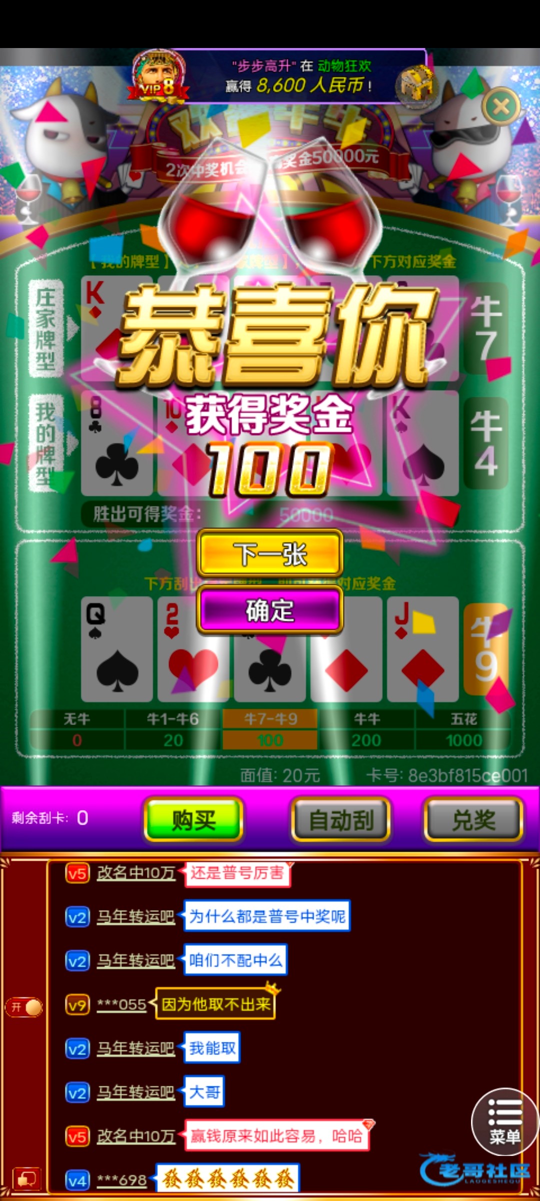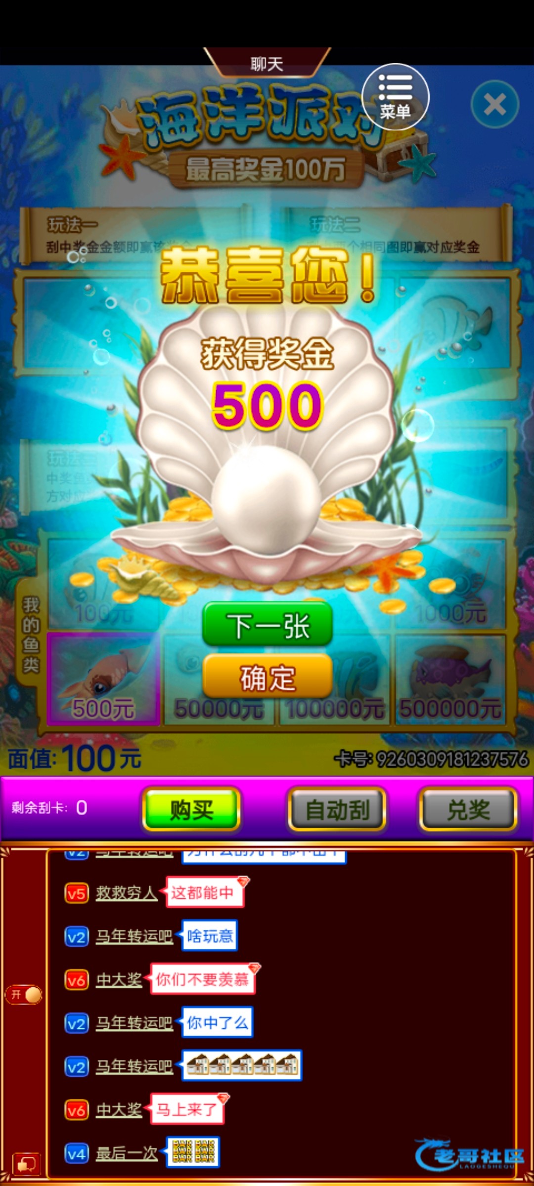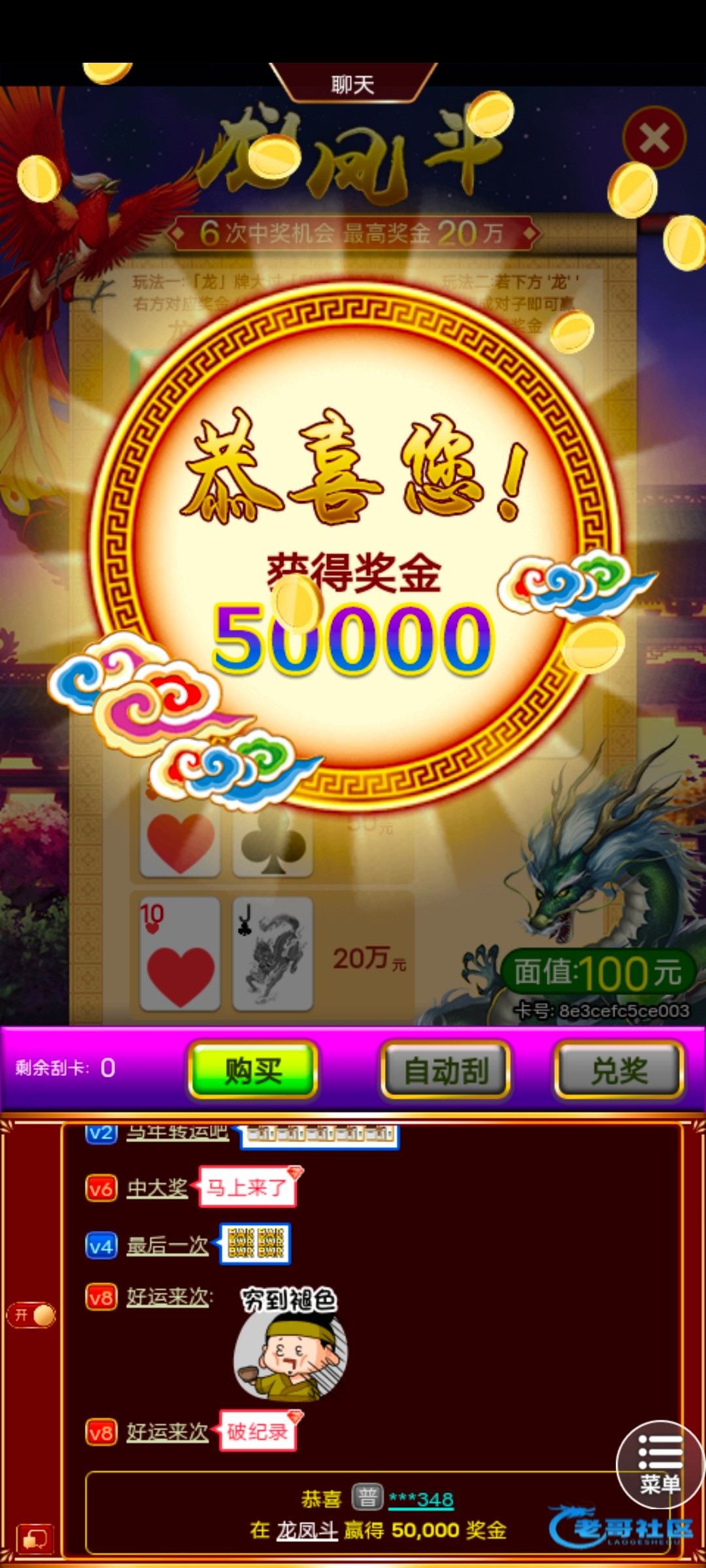 我100中了1100,提现睡不着,回充买100的,刚开始买的海洋派对第一张就中了500,后面一直空,剩200的时候我换这个龙凤斗,一张就中了5万,你看这张图的聊天框和我中5万的聊天框就知道期间没有间隔多久,总的来说就是100赢了5万,我还怕他黑,结果没黑我