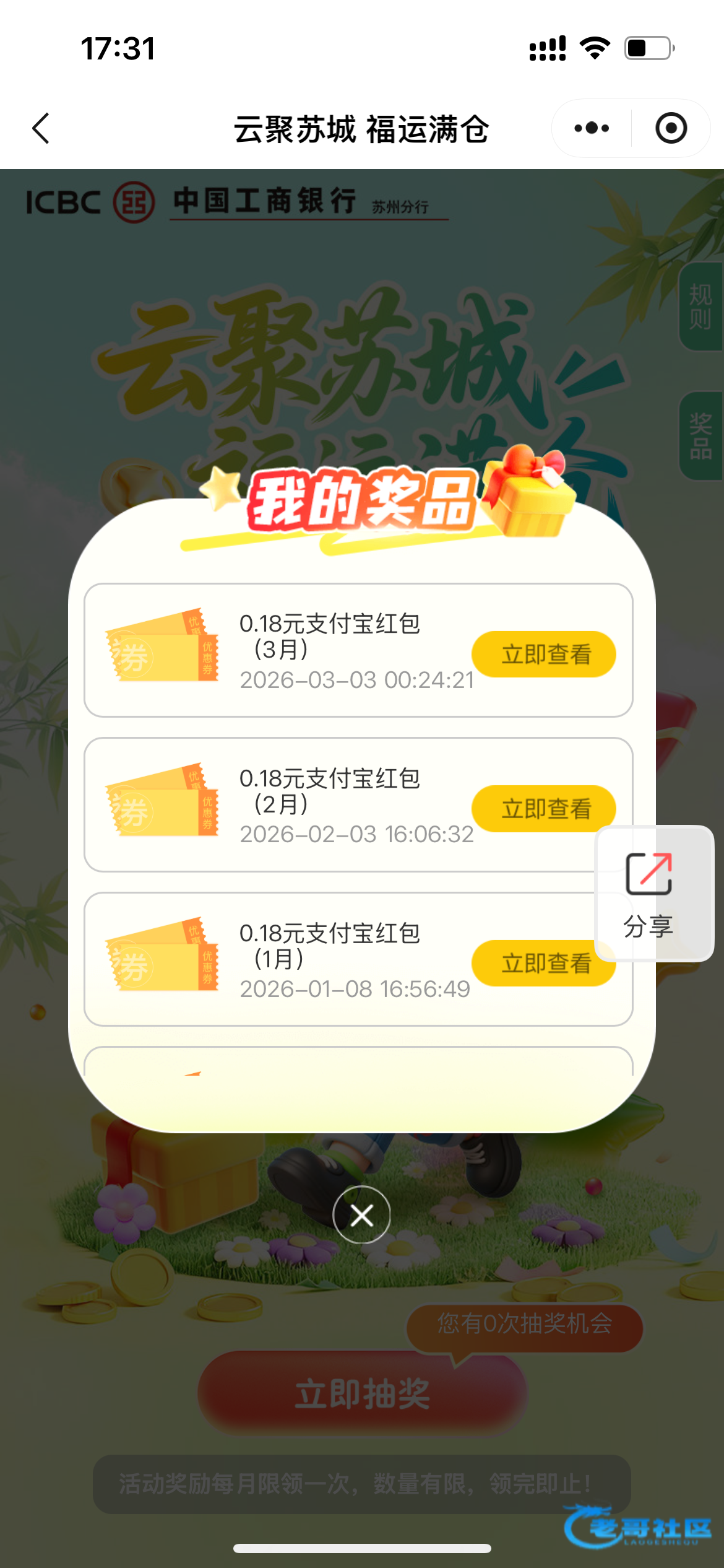 登陆微信小程序,首页横幅进去抽,每月一次,最高8.8