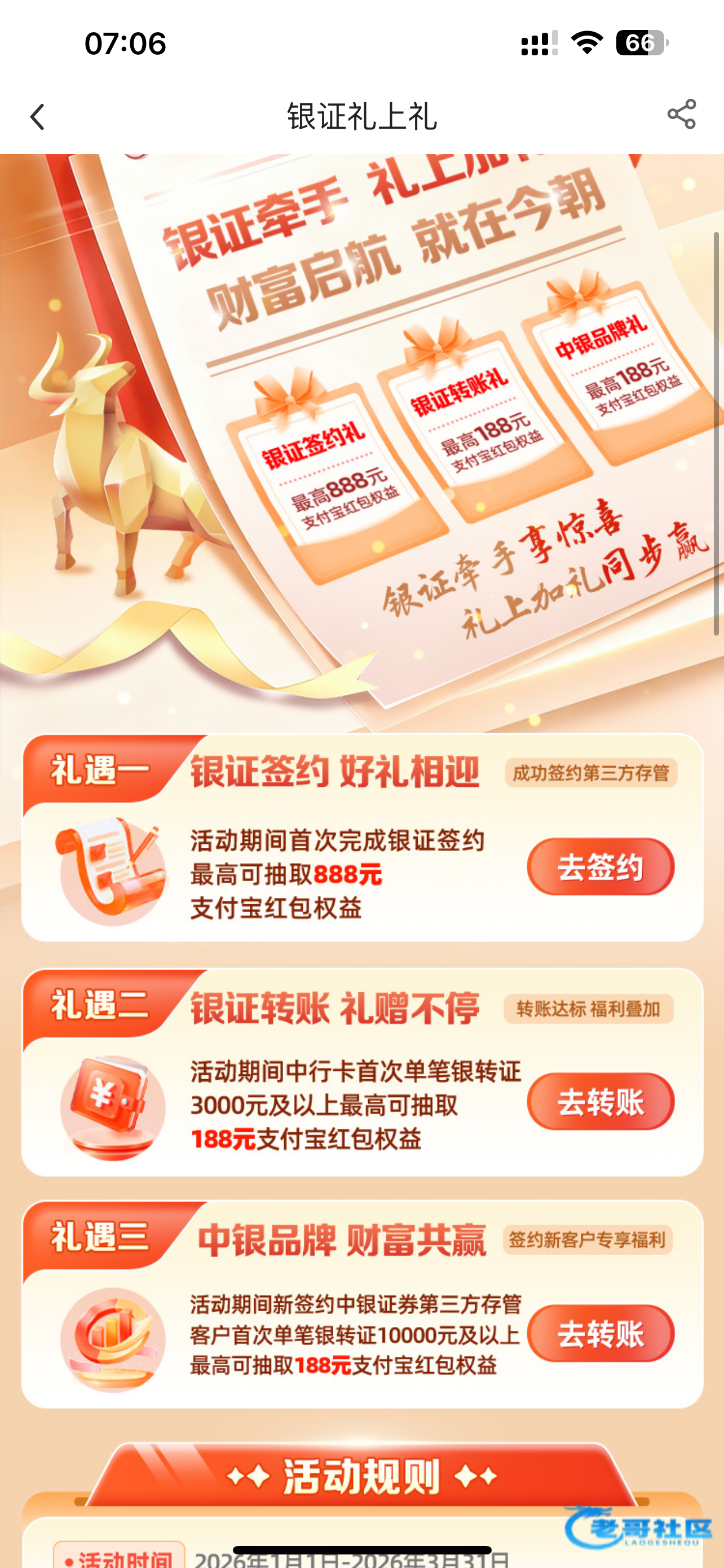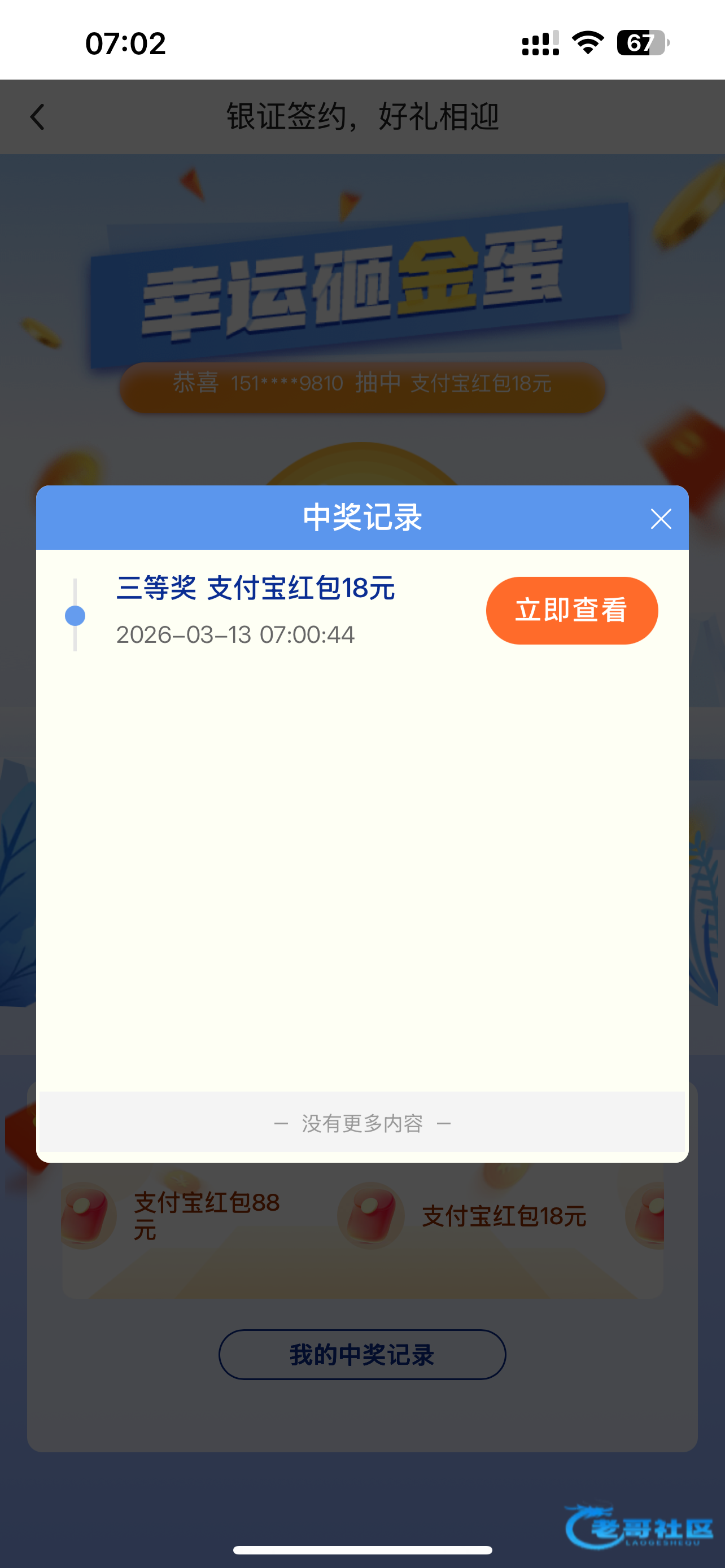 支付宝财富宠粉节,开通过中国银行证劵的,去下载中国银行app,还可以继续抽奖,最少18支付宝红包,最高888。中国银行点进去,首页就会弹出这个银证礼上礼,点进去第一个抽奖就OK。亲测抽到18红包