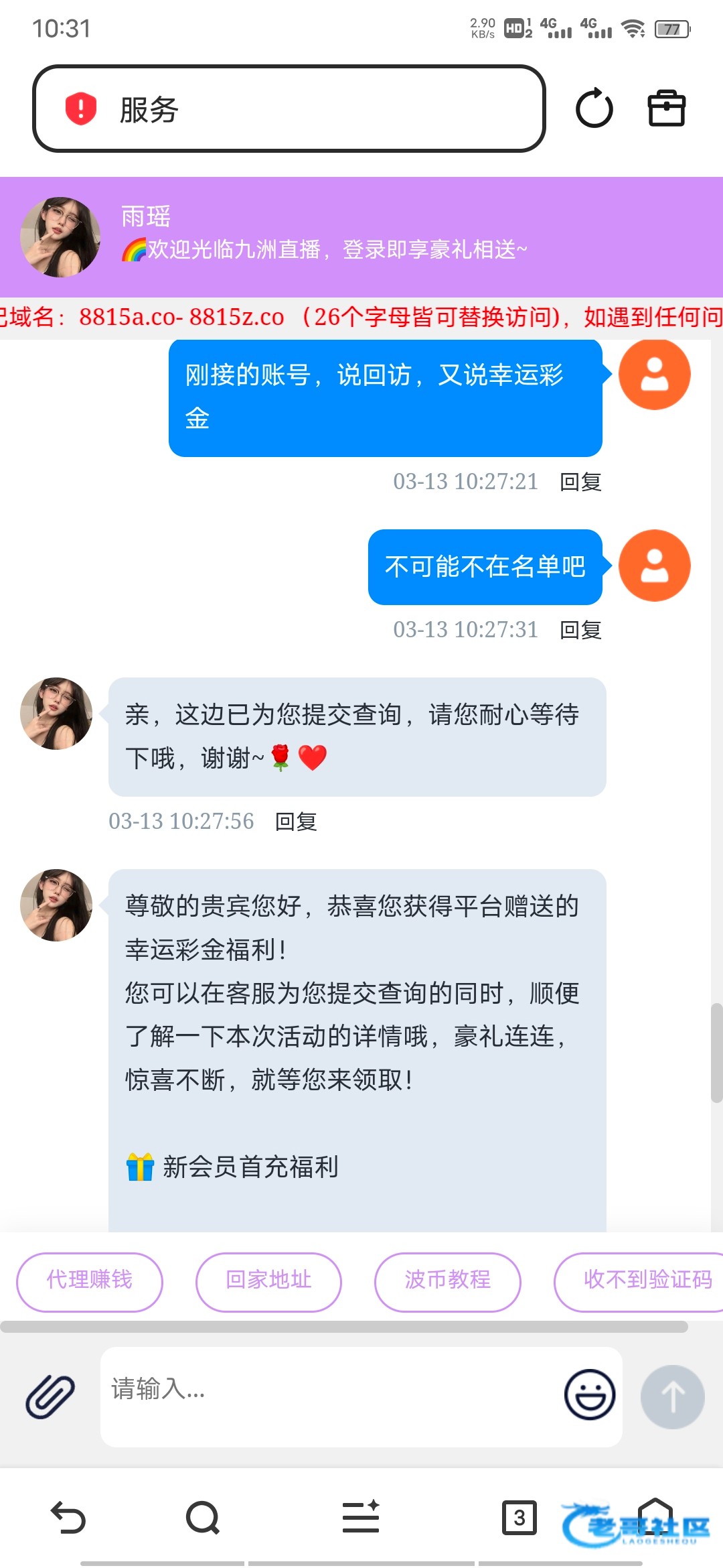 说回访彩金没在名单,然后说幸运彩金给了