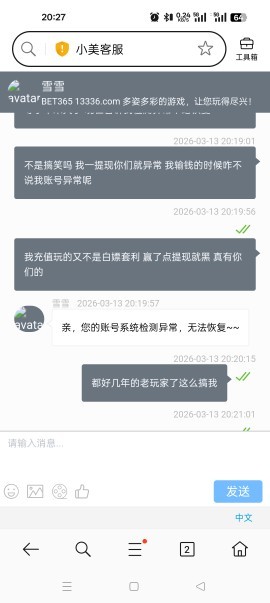 充五百提2700 账号给封了说账号异常 前面几天还输了好几百进去 好不容易赢一次还给我黑了 老用户都黑妈的
