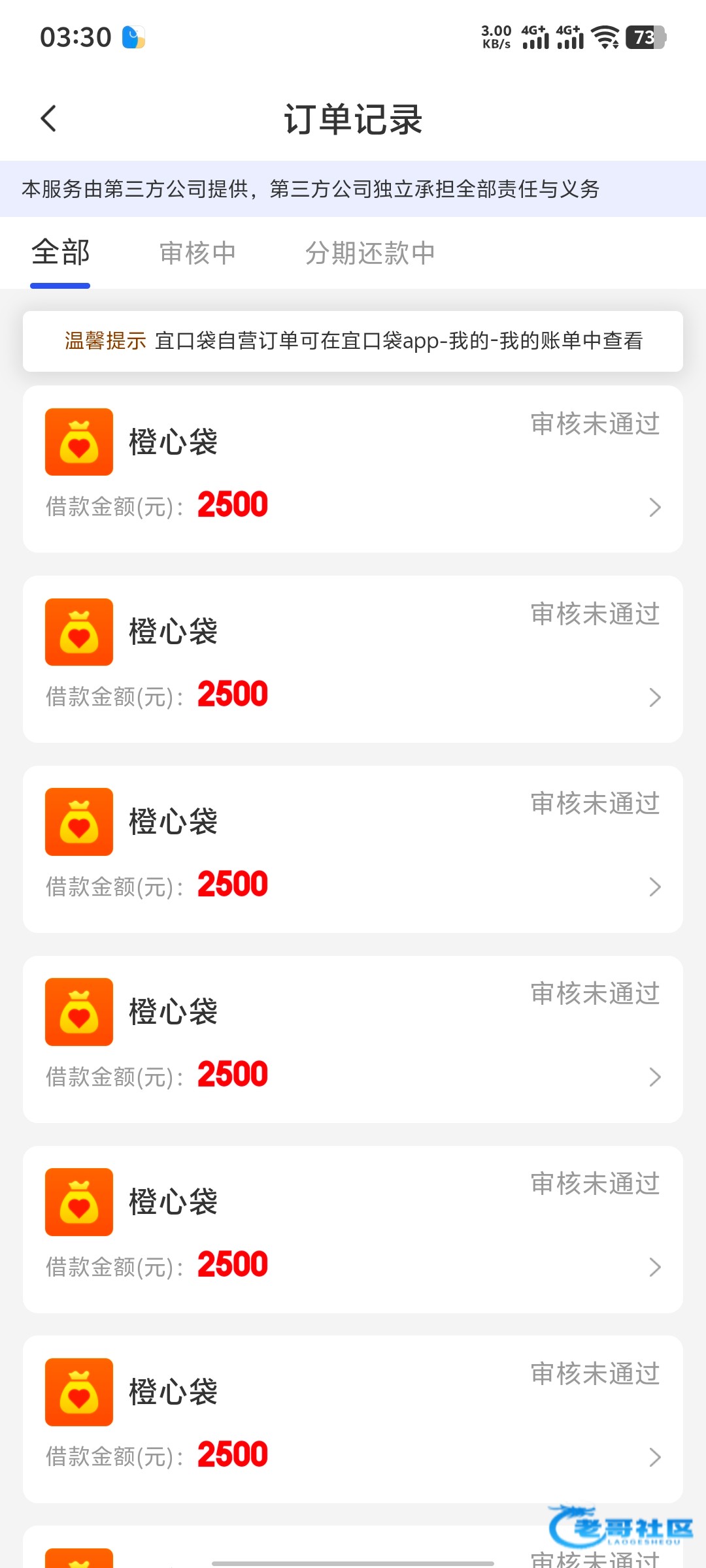 之前橙心贷是1000额度只能借500。然后我今天去借剩的500审核没通过。过了两分钟后就给我提额了2500还是借不了!