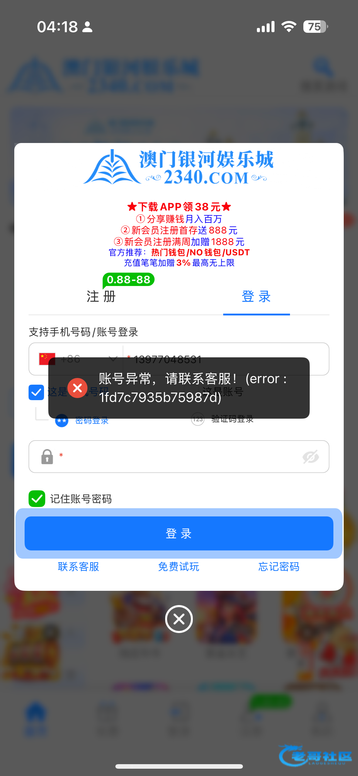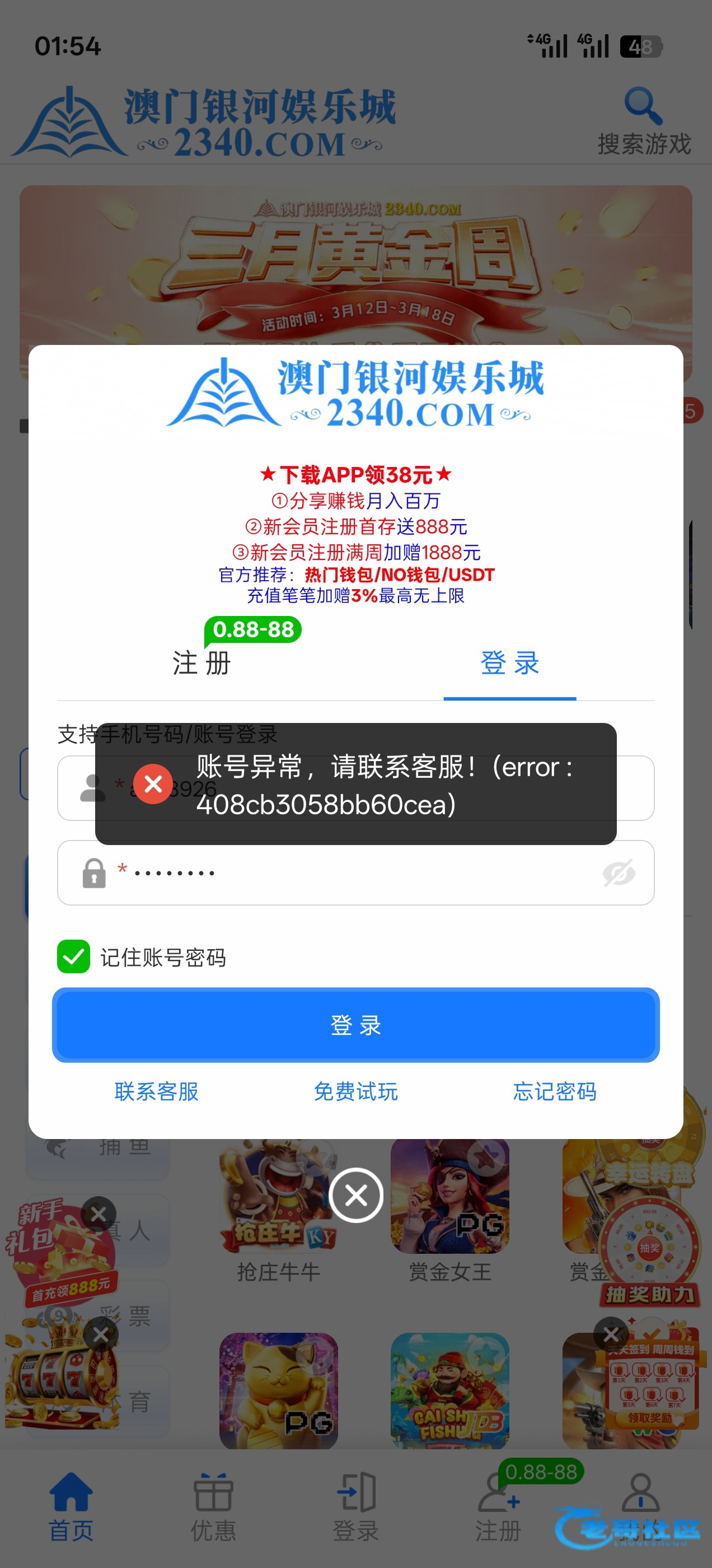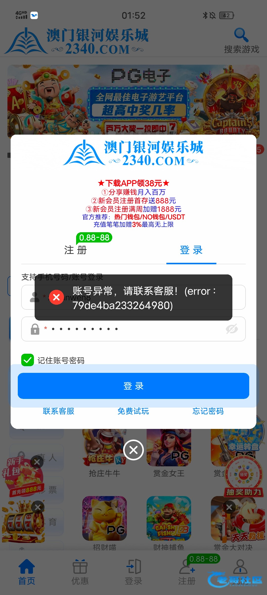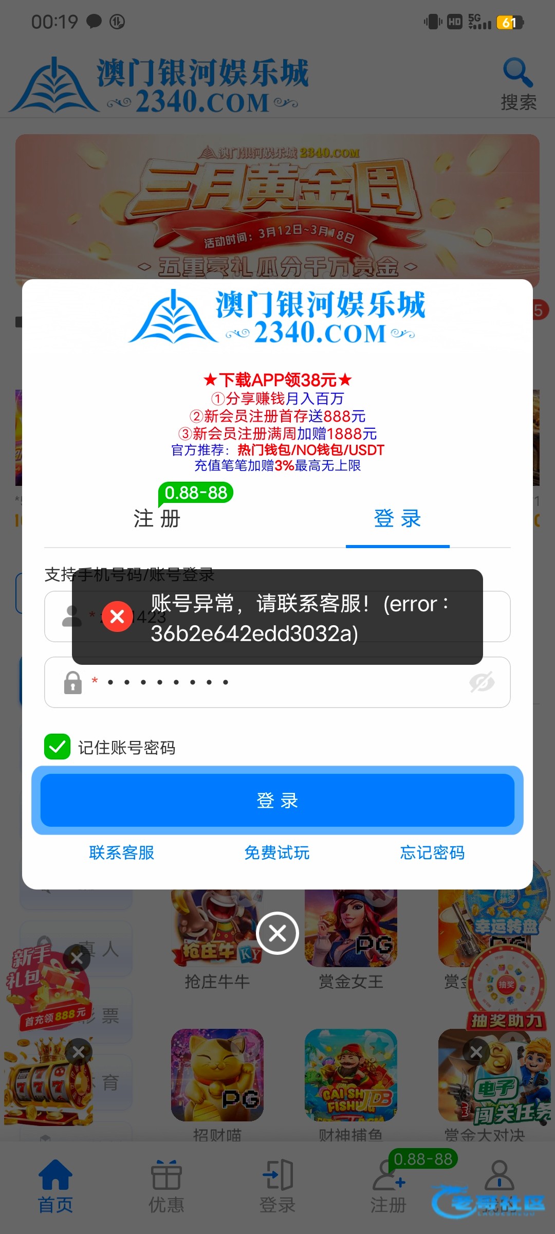昨天白天忘了玩,刚才打上500提款封号。赔20,前天注册充值的