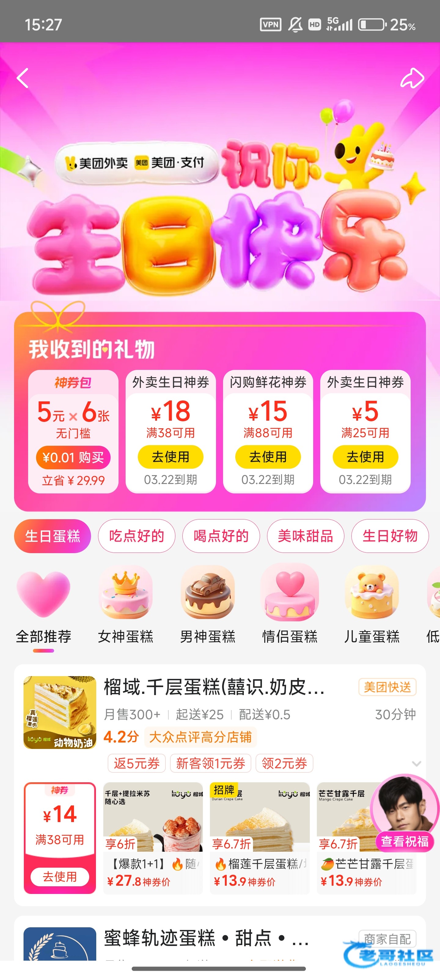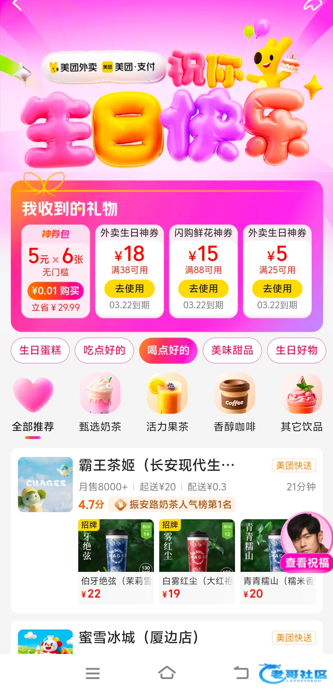 2-主页,点击外卖,下方有个生日快乐图标。点进去领取蜜雪冰城优惠券。