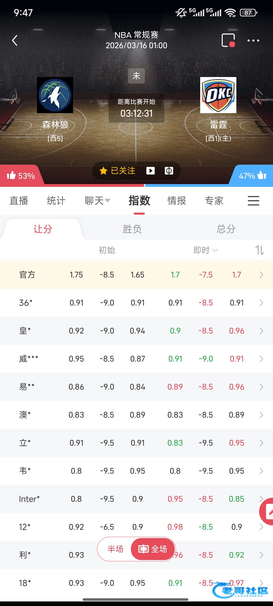 半夜比赛还是小分多 雷霆跟凯子差不多领先就浪投压时间 输8场让分盘了不知道会不会断龙