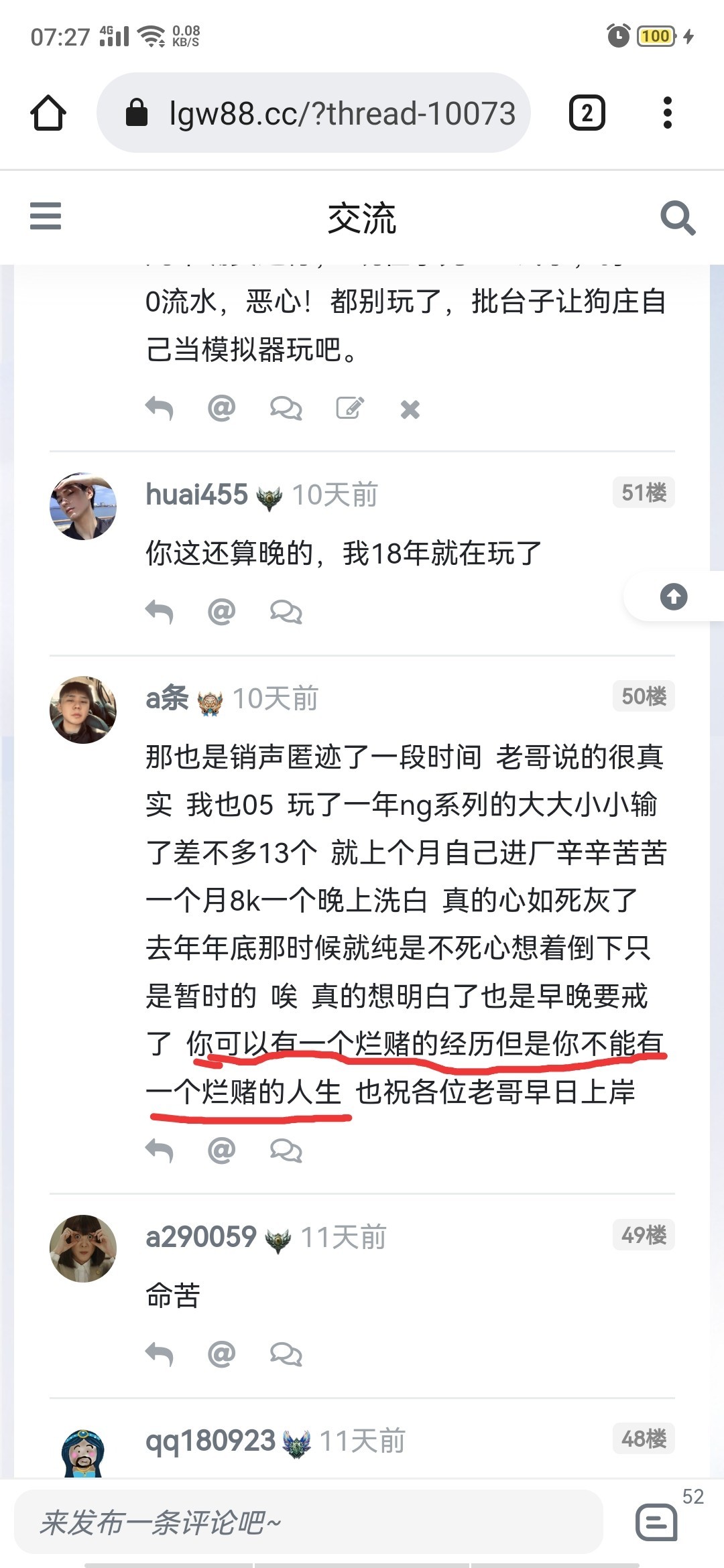 19年接触的wd,前几年确实还可以,输输赢赢的,没输多少,也没那么太惨。就从去年下半年挂壁到现在,一年了,真的赌不起了,充不起了,累了!三天两顿的,过年别人喊去打个5块钱小麻将娱乐一下都打不起!刚才看到一个小老弟的评论,真的醍醐灌顶!社区uid227,千言万语难说,希望兄弟们都好!