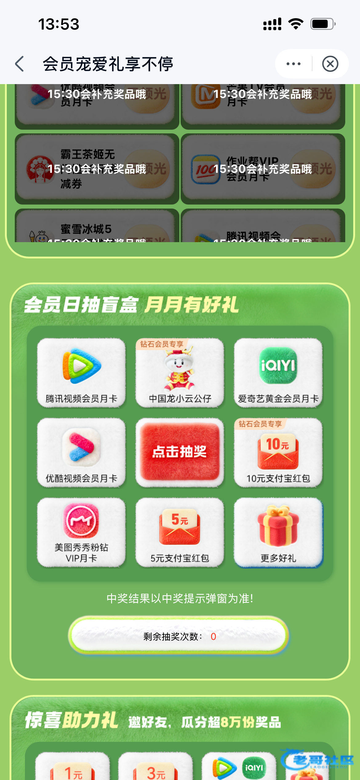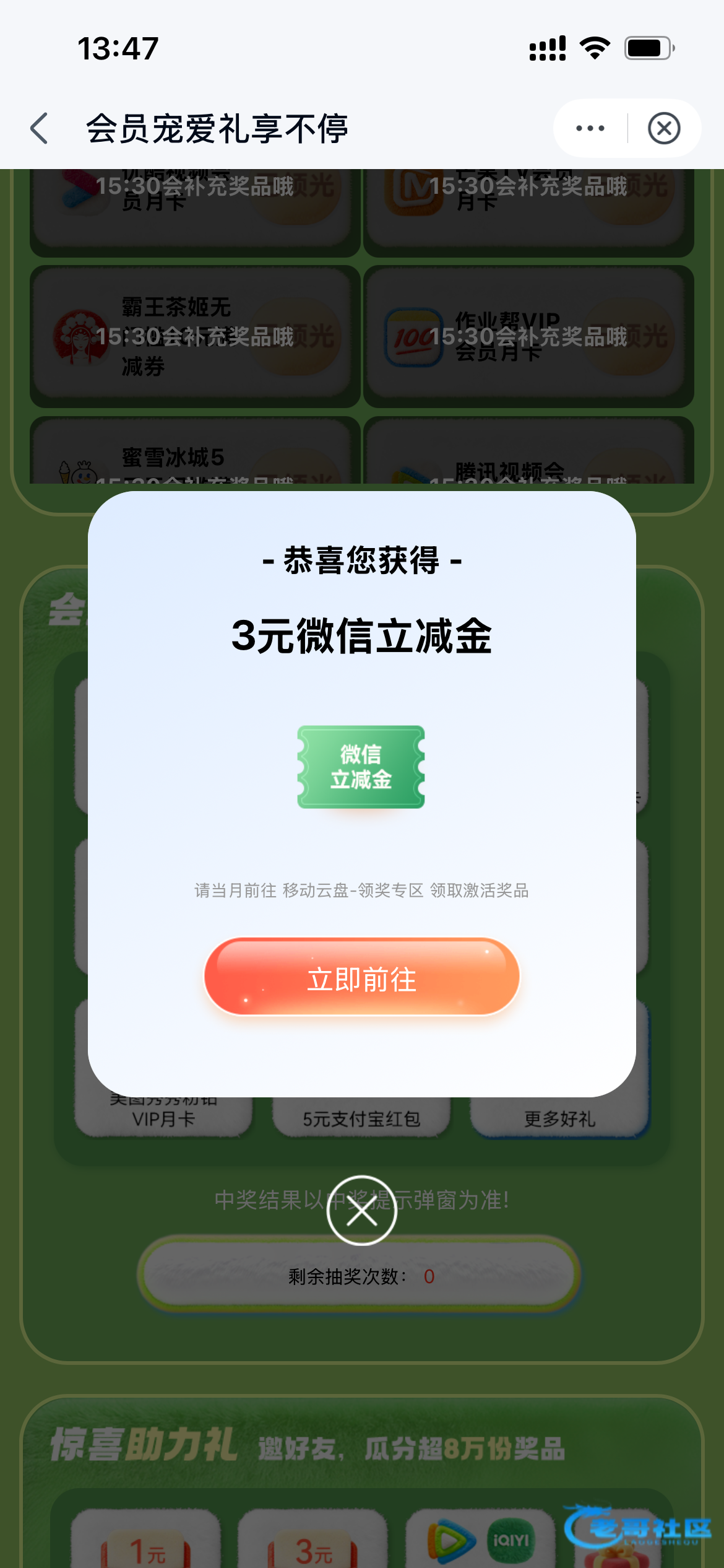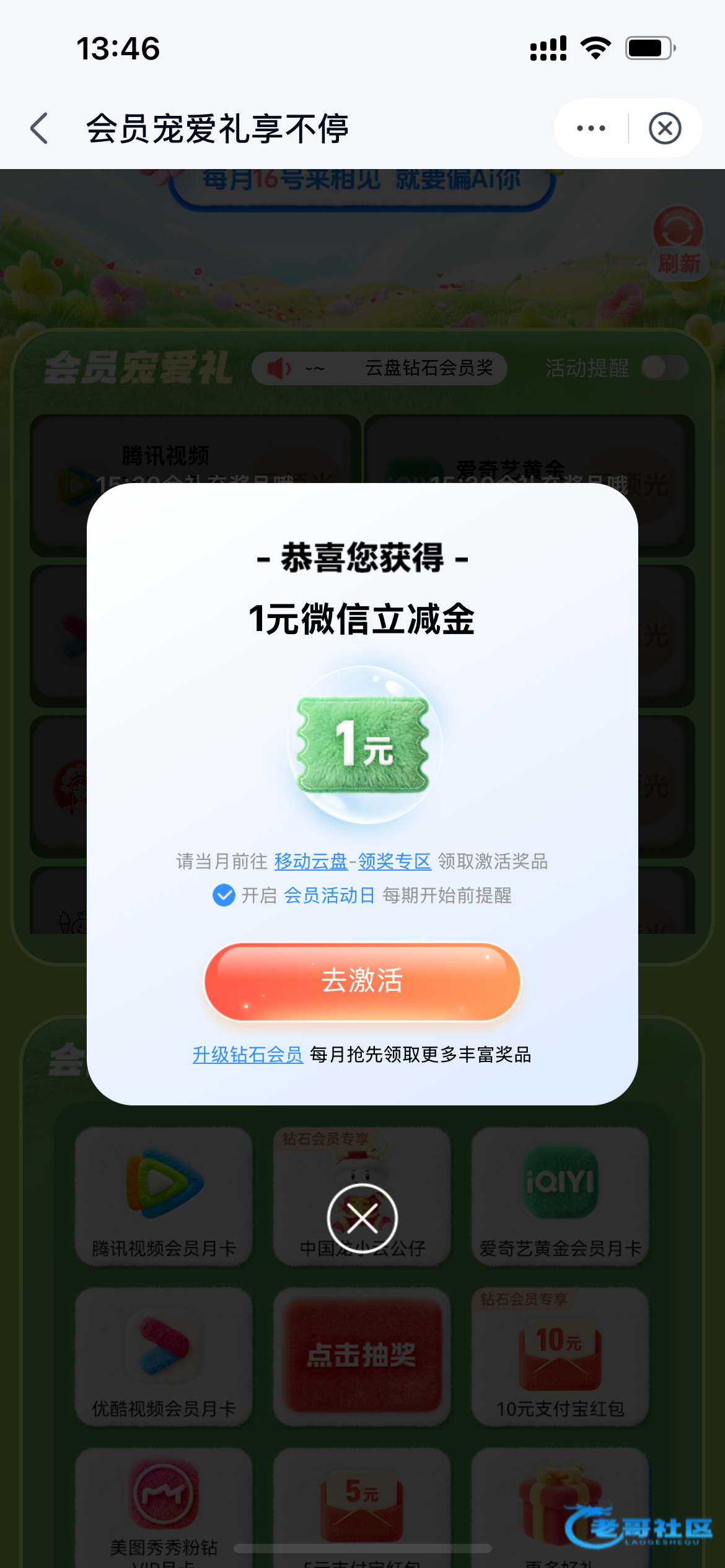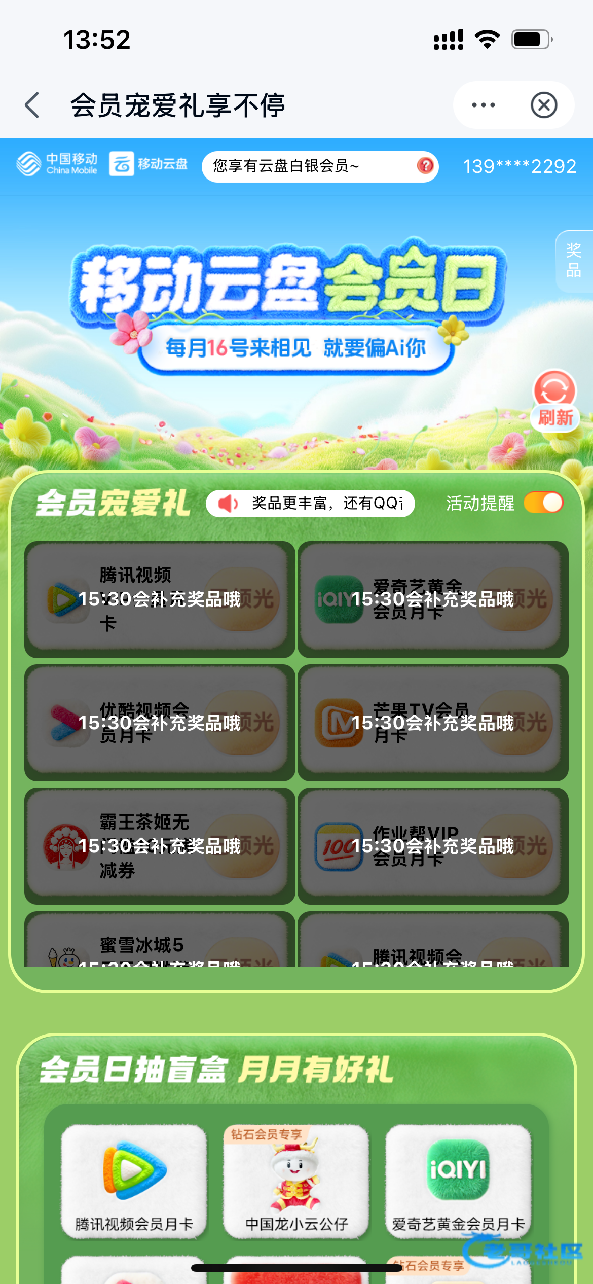 中国移动云盘APP-点击会员活动日-领取立减金-抽奖-视频会员月卡15:30补货