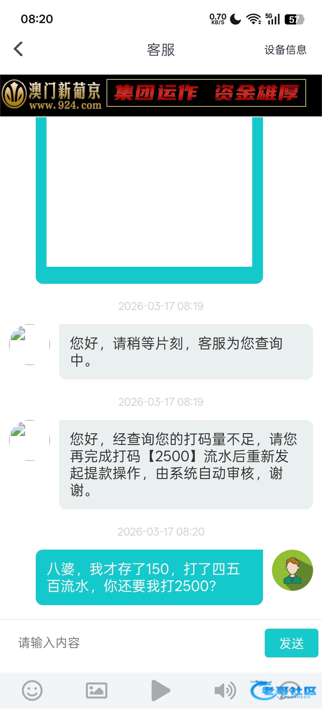 今天刚睡醒,看到老哥网上有人发帖新出个50钱包。购买100元的币,赠送38元。手头仅剩100。 兴冲冲充值100。买币 找不到平台充值 根据的那个发帖老哥提供的平台充值138了。 打到200块说流水过低。 被罚300水。 成功打300水,出款之后 又说流水还是低,又罚600。 打了600之后, 提500 又继续说流水过低。 又罚了1500。大家避雷