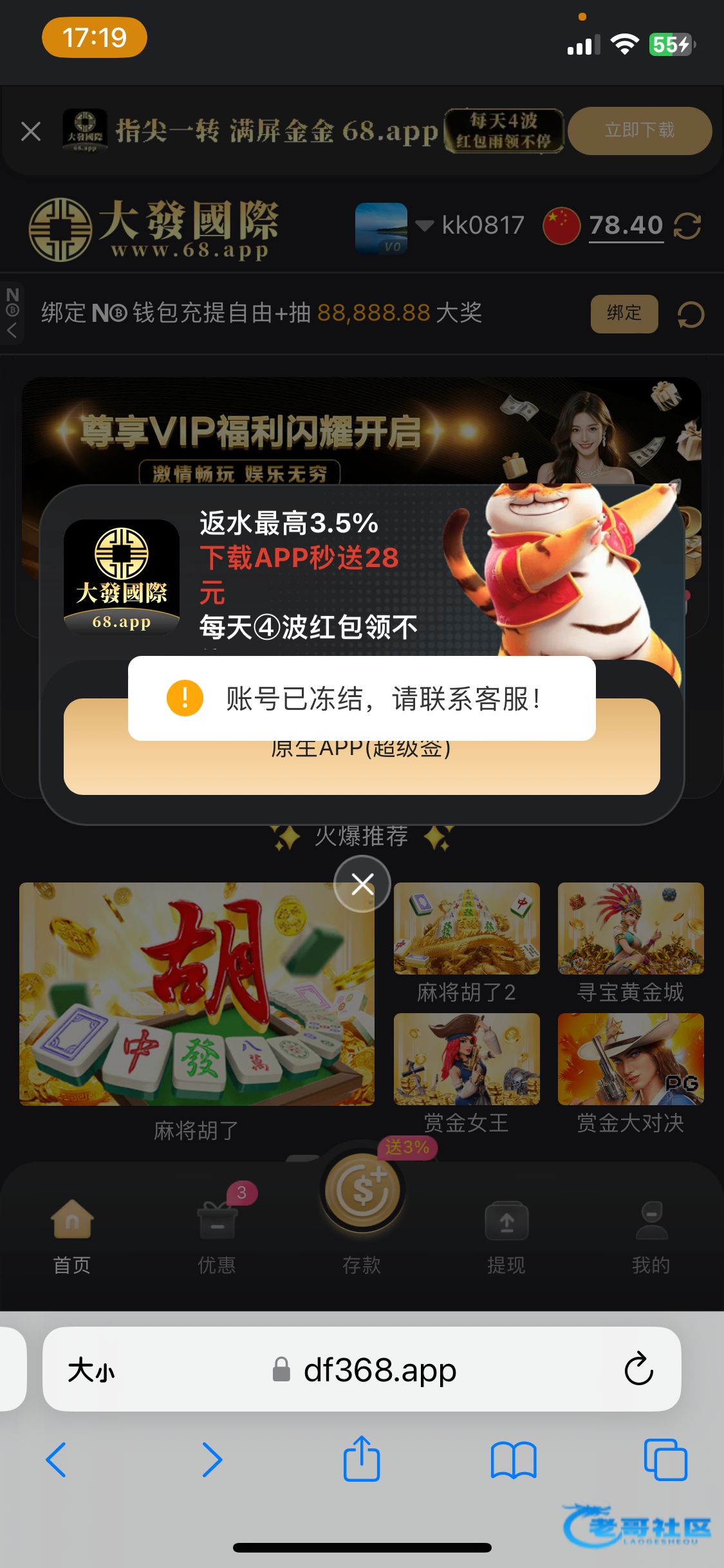 充值去玩个首存。我靠,没玩两下就把我账号冻结了。也不懂什么原因,这逼台子,客服也不回信息