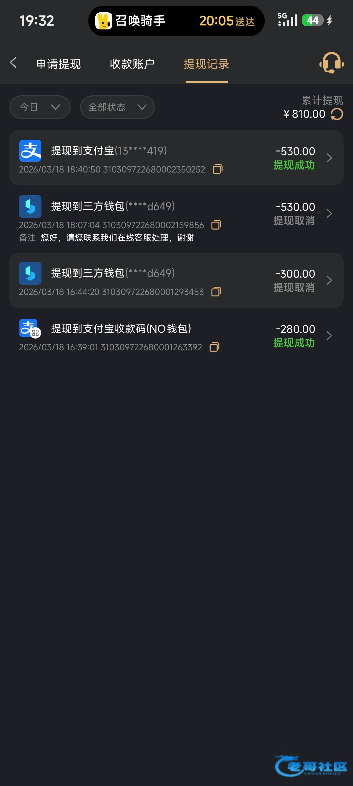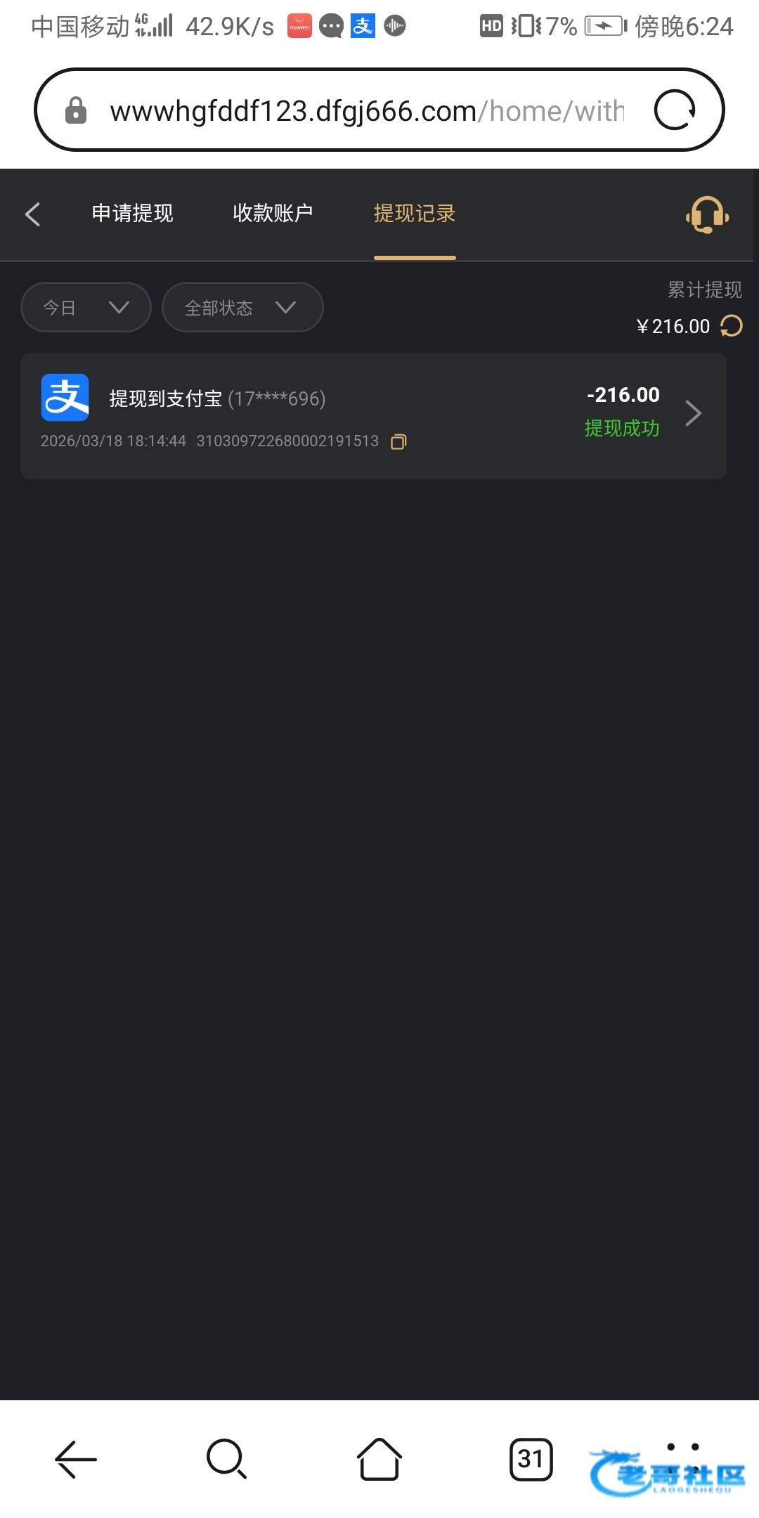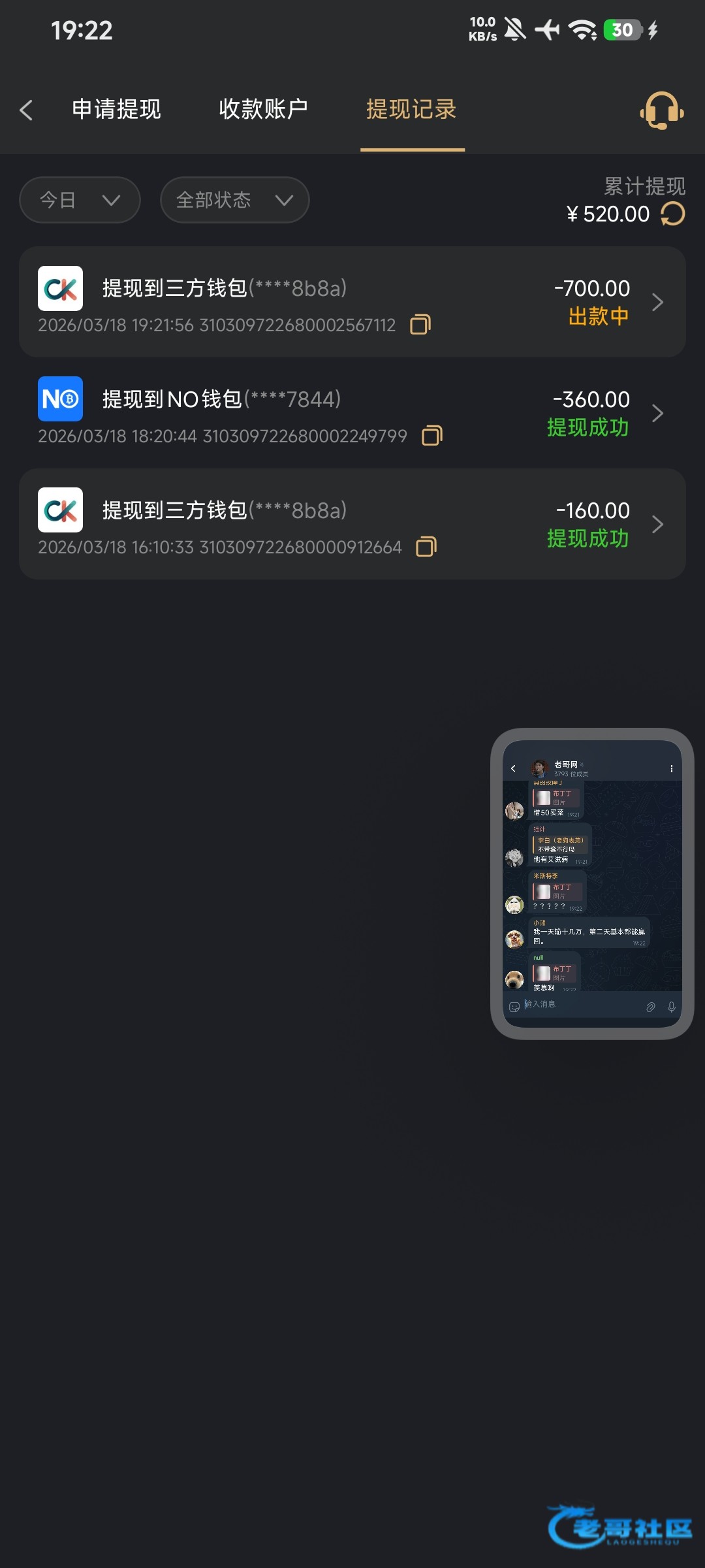 一个号提了40另一个提了20不敢打多,但都到账了