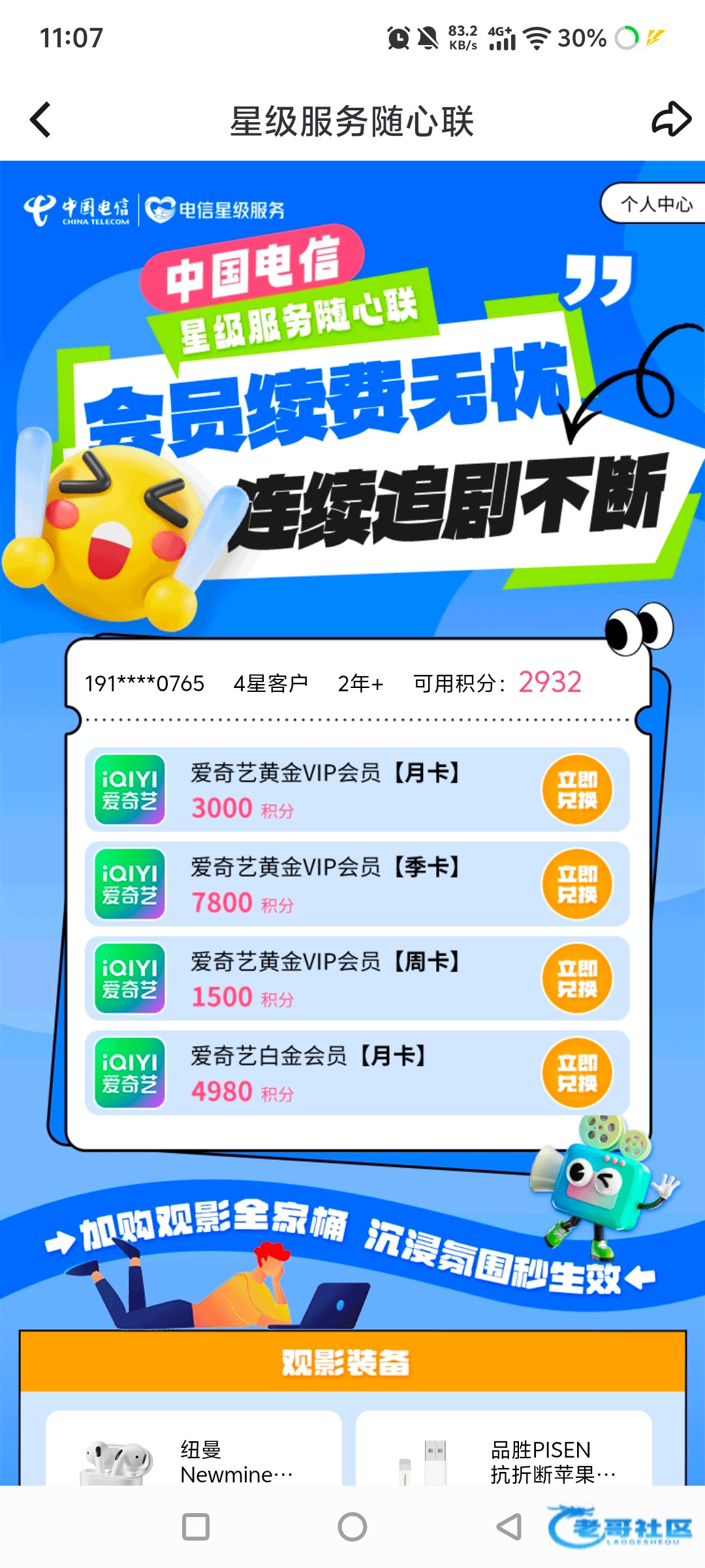 月卡/周卡中国电信APP有积分的可以去爱奇艺-我的-钱包-钱包送会员 3000积分兑月卡 我自己兑换了月卡,喜欢追剧的可以去看看,积分不够的可以去中国电信APP下拉积分兑换-也有周卡和月卡