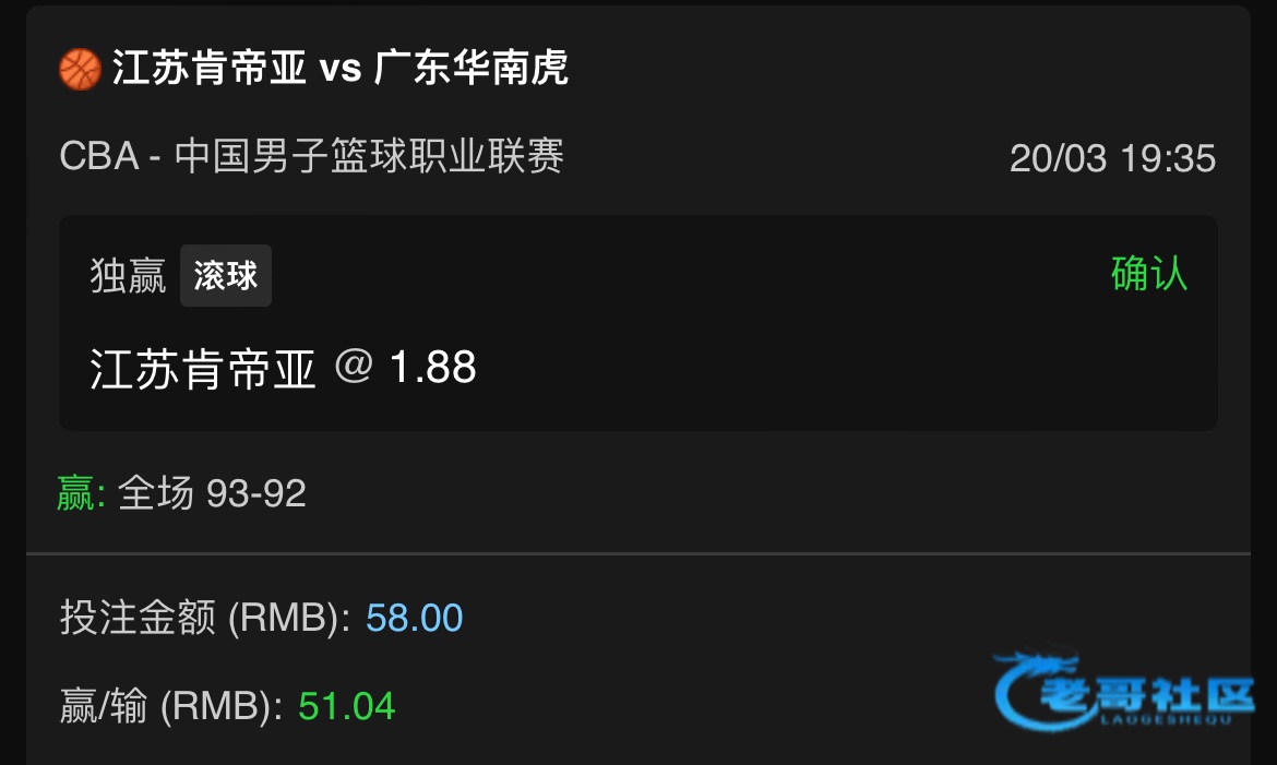 押了独赢。最后时刻落后7分以为没戏了呢。赛前华南虎赔率1.03。结果还输了,也是爆冷吧....