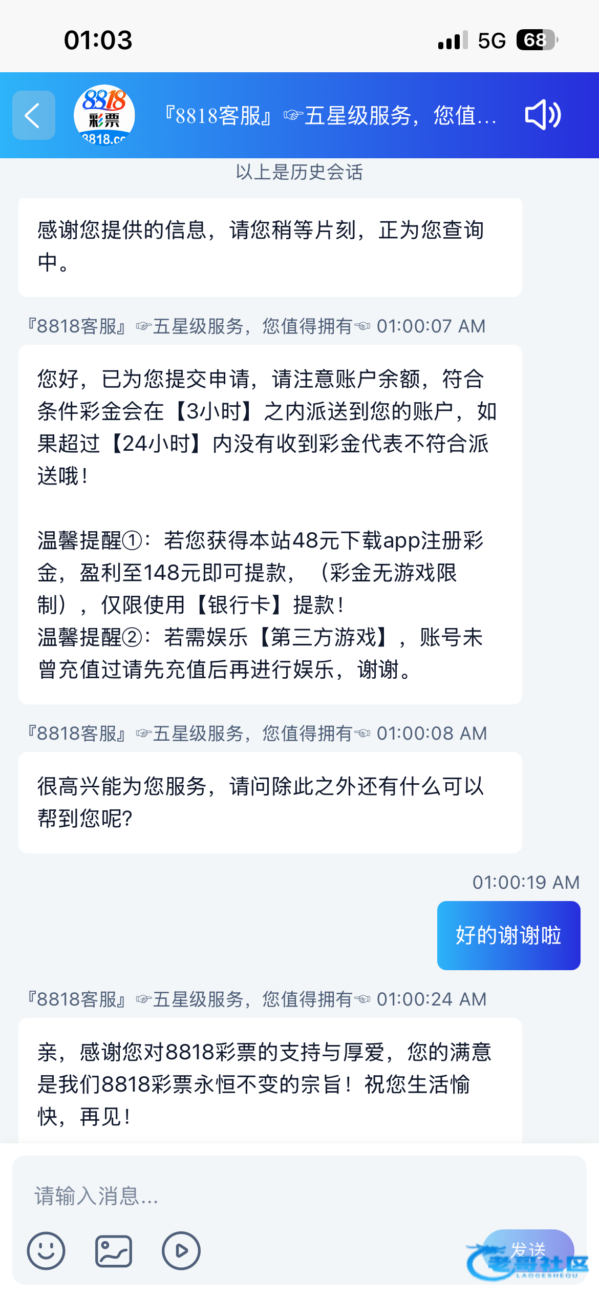 您好,已为您提交申请,请注意账户余额,符合条件彩金会在【3小时】之内派送到您的账户,如果超过【24小时】内没有收到彩金代表不符合派送哦!温馨提醒①:若您获得本站48元下载app注册彩金,盈利至148元即可提款,(彩金无游戏限制),仅限使用【银行卡】提款!温馨提醒②:若需娱乐【第三方游戏】,账号未曾充值过请先充值后再进行娱乐,谢谢。『8818客服』☞五星级服务,您值得拥有☜ 12:58:38 AM很高兴能为您服务,请问除此之外还有什么可