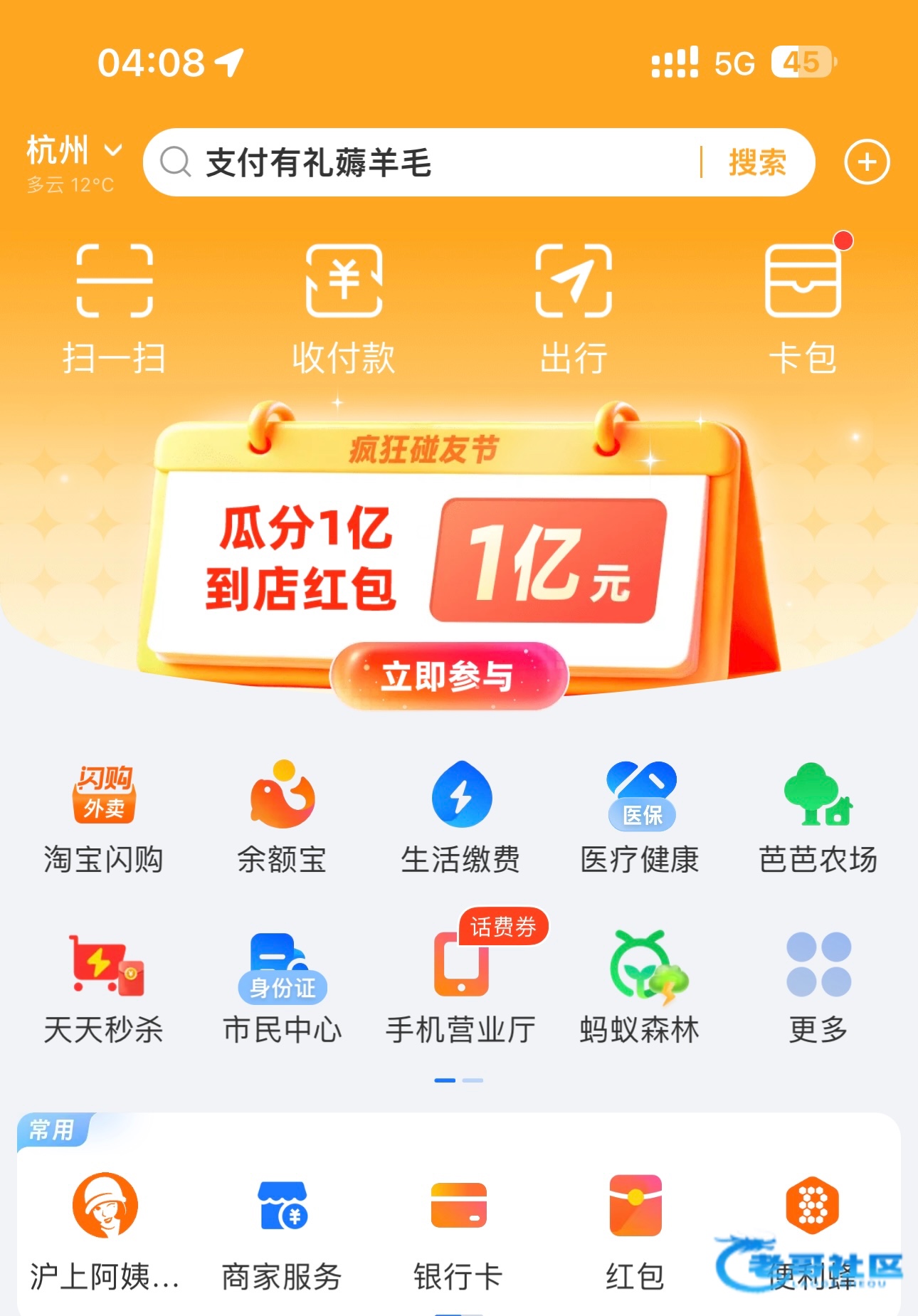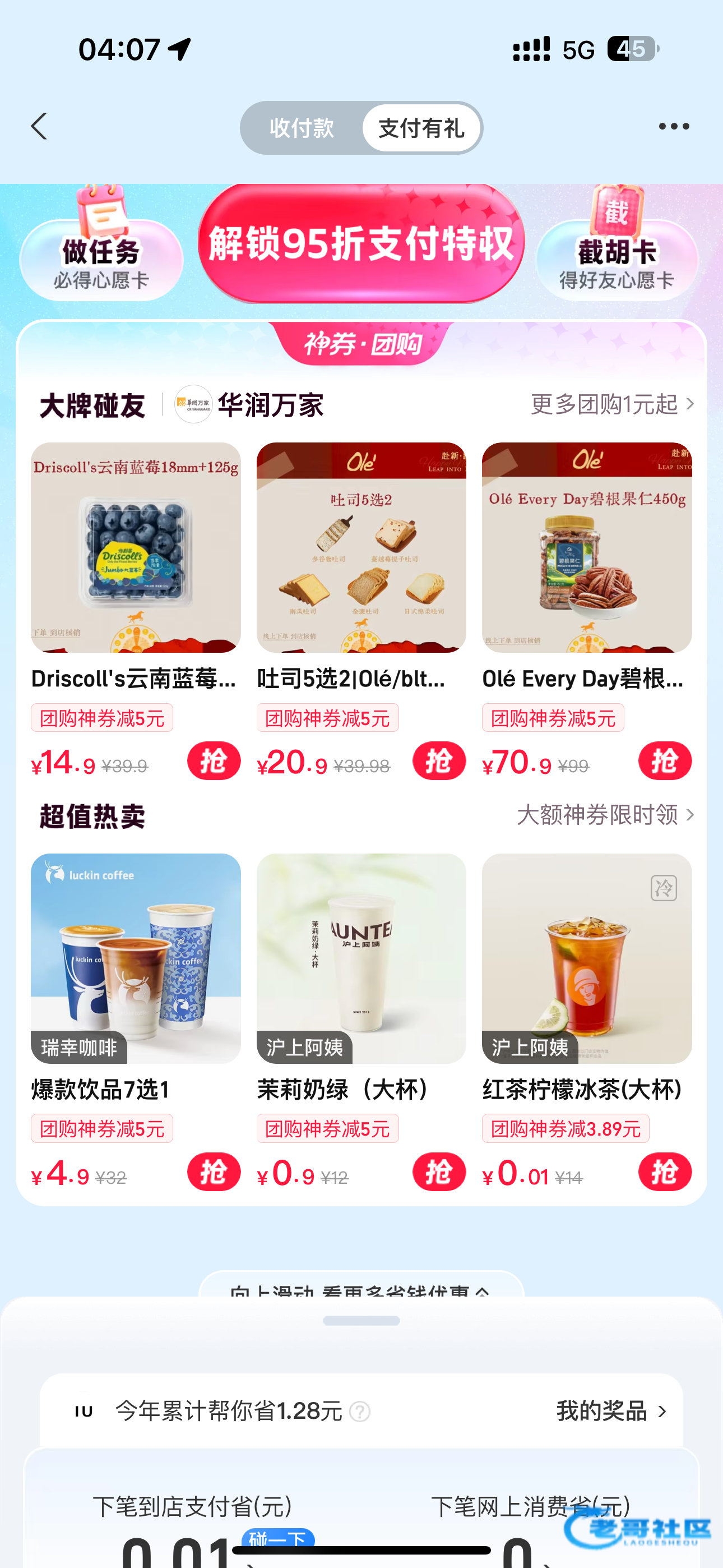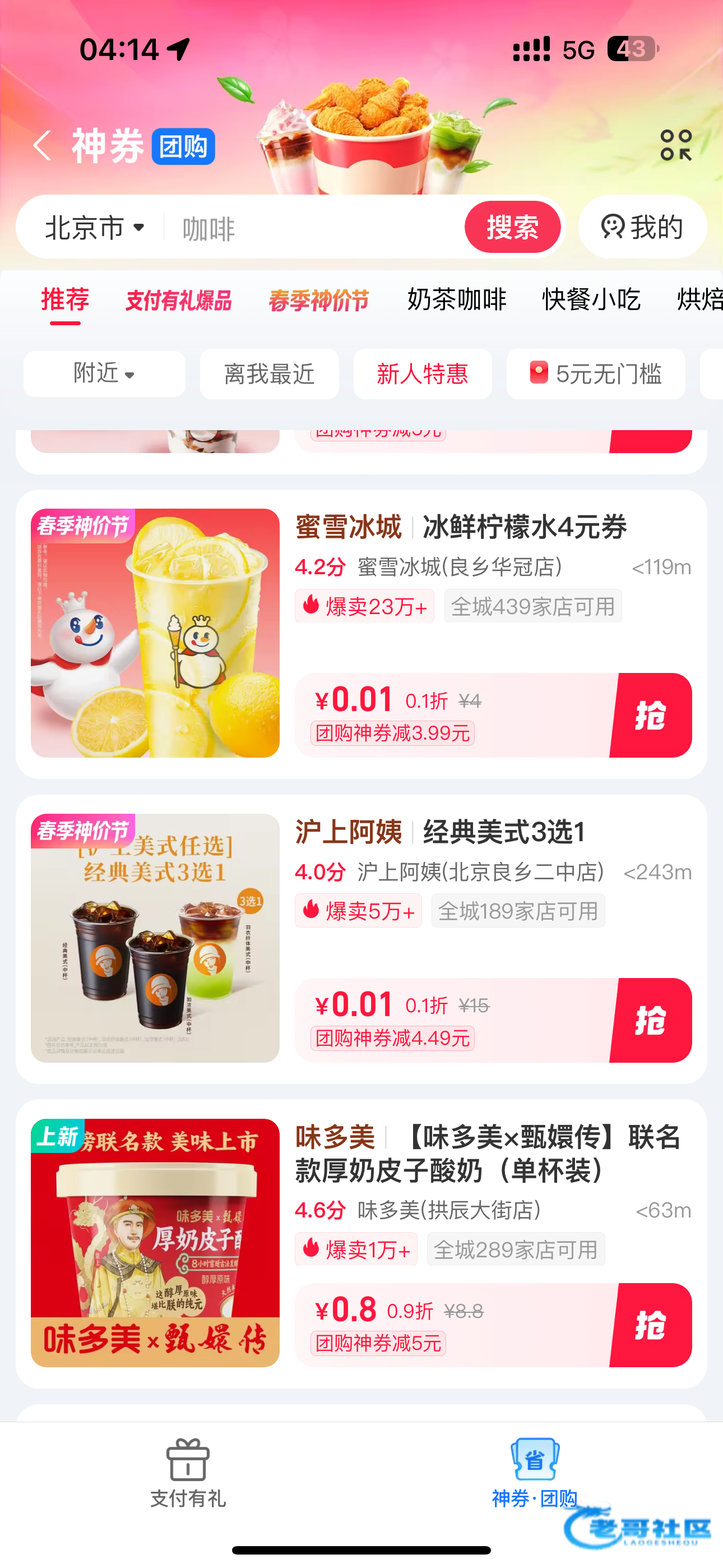 在支付宝首页 活动点进去 然后下拉就能看到 然后点右上角更多低价团购里面吃的喝的都有 有需要的老哥可以去 我0.01买了杯奶茶