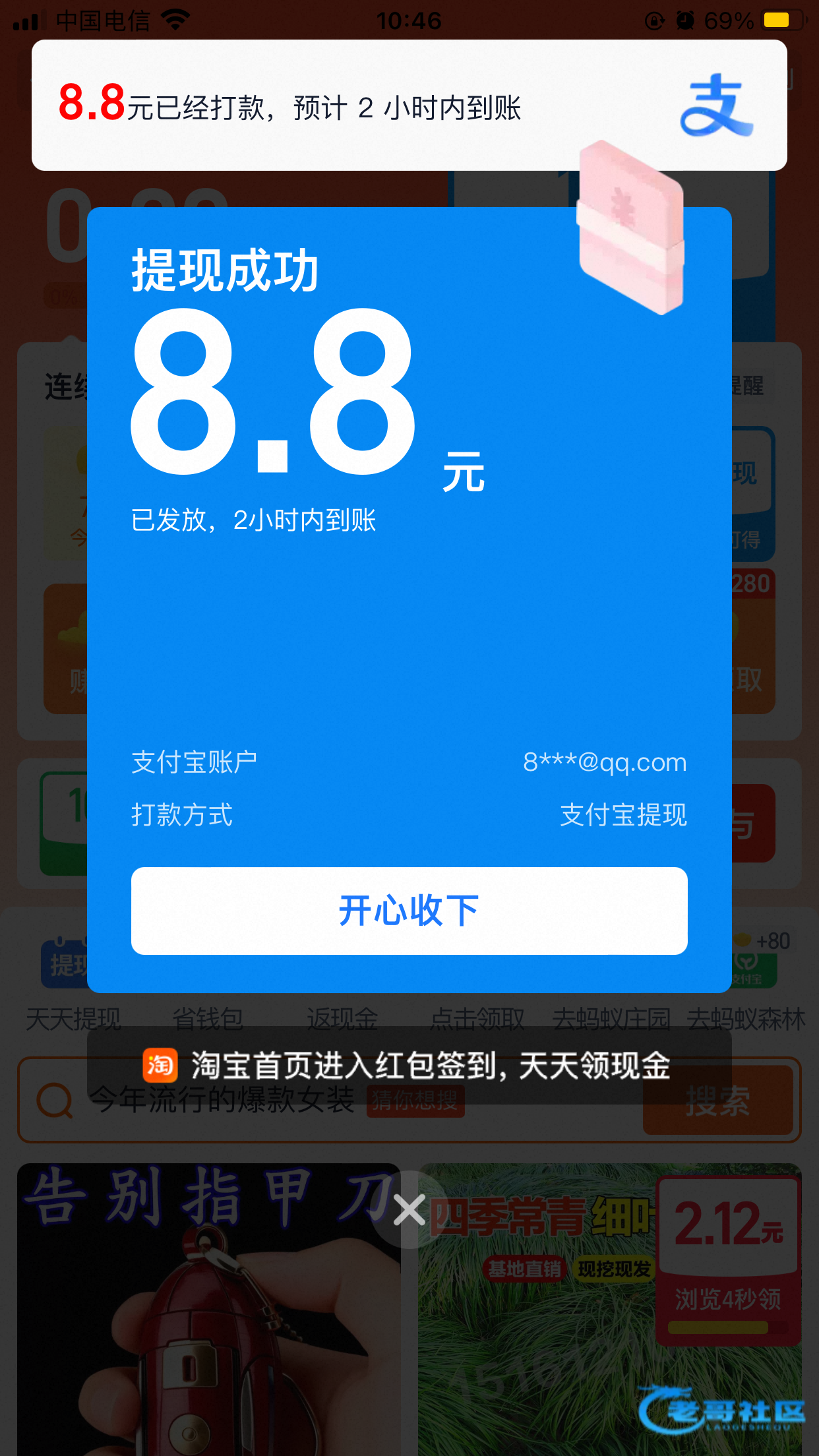 不知道是放水还是因为我是第一个搞 两个号都是8.8 打开淘宝点我的然后下面有个红包签到点进去 一般都是进去自动弹窗然后点一下开就行 抽多少看运气 骂人的中出