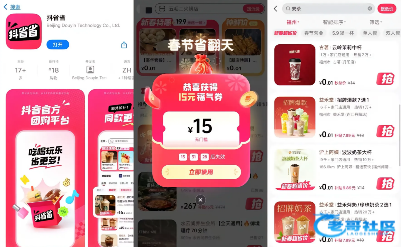 抖省省app,首页弹窗10/15无门槛抖音团购全部可用,有0.01奶茶