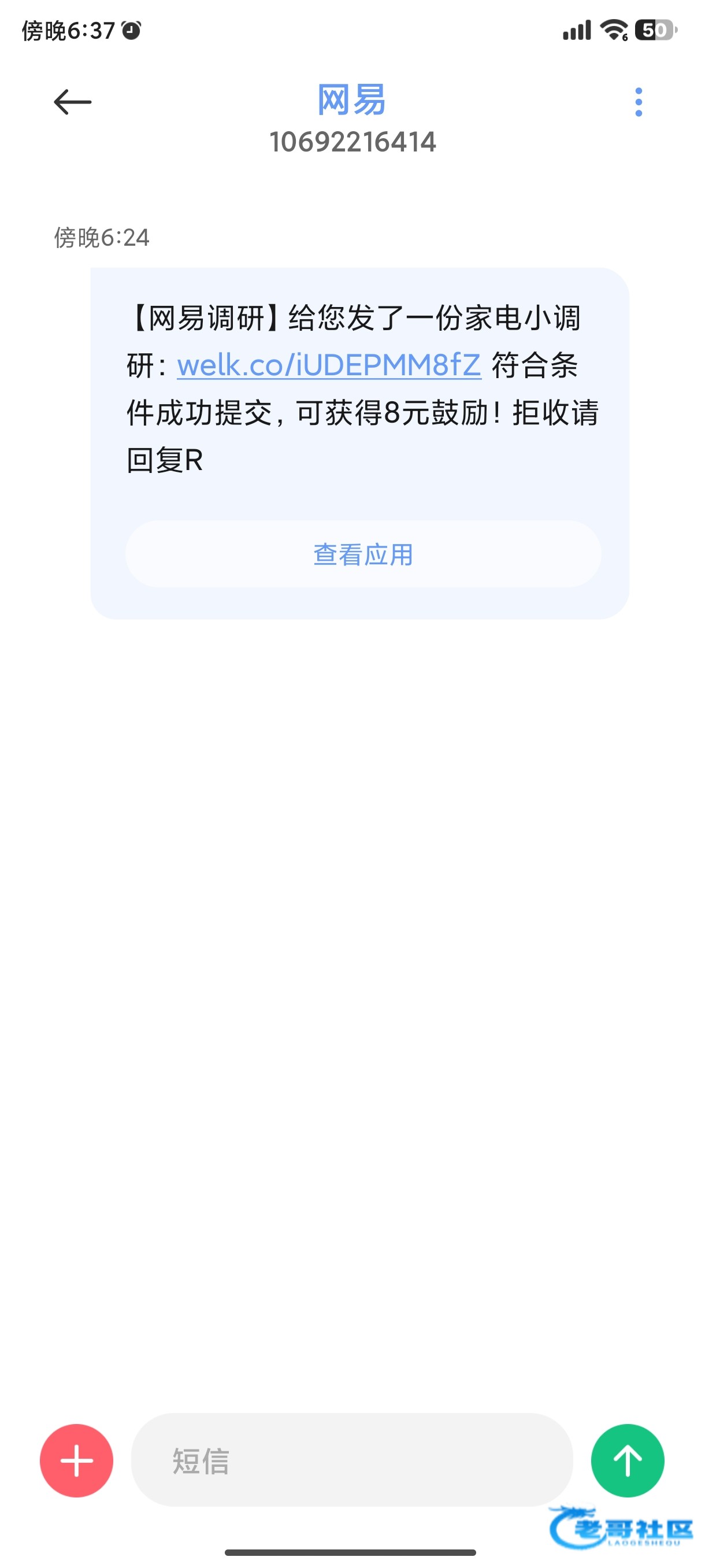 【网易调研】给您发了一份家电小调研:welk.co/iUDEPMM8fZ 符合条件成功提交,可获得8元鼓励!拒收请回复R