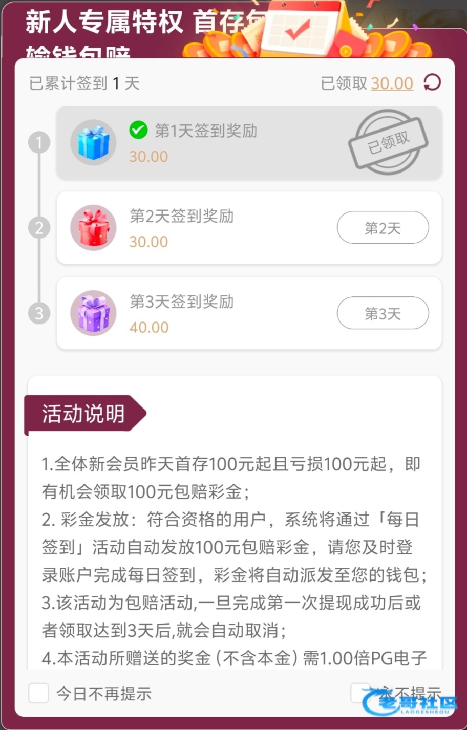 今天输了100没提过款的包赔100次日送 不需要充钱签到 直接签到就行 分三天送第一30第二30第三天40