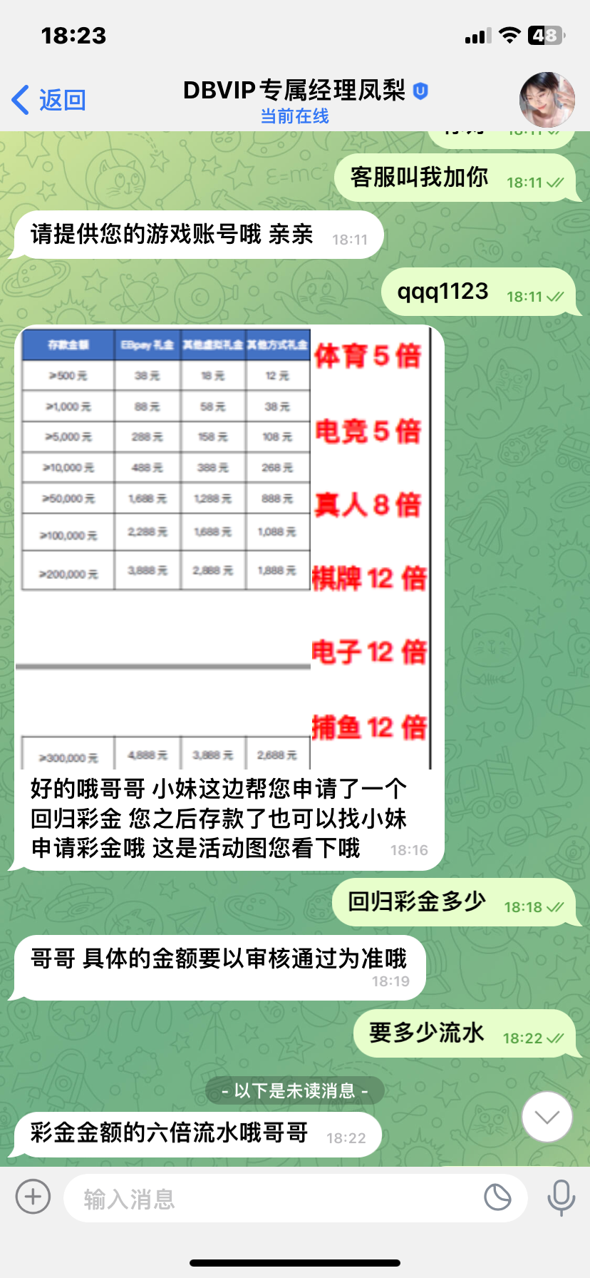打到了600,专员说只能提彩金的三倍,剩下的要充值同等金额或者大于剩余金额,一倍流水就可以提款,我提了100看看能不能出