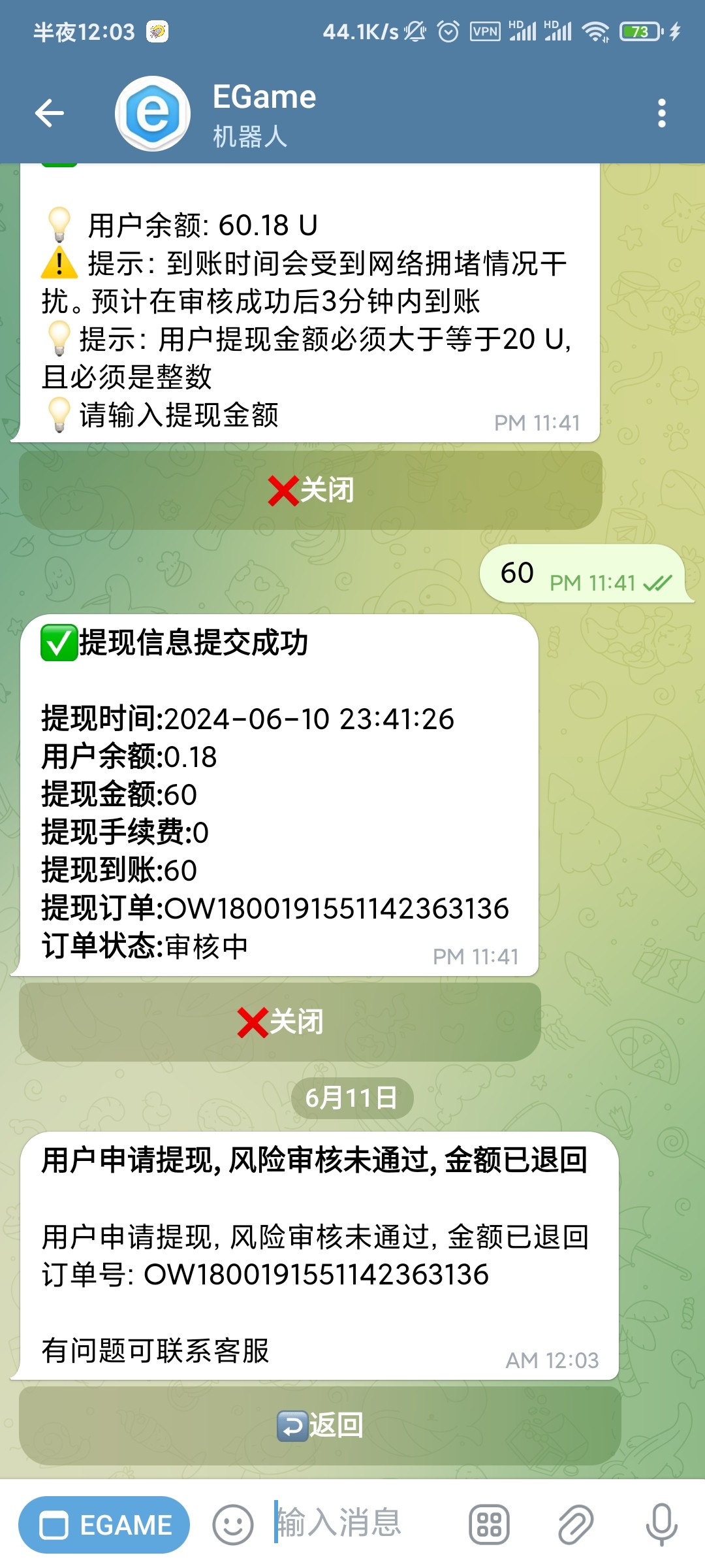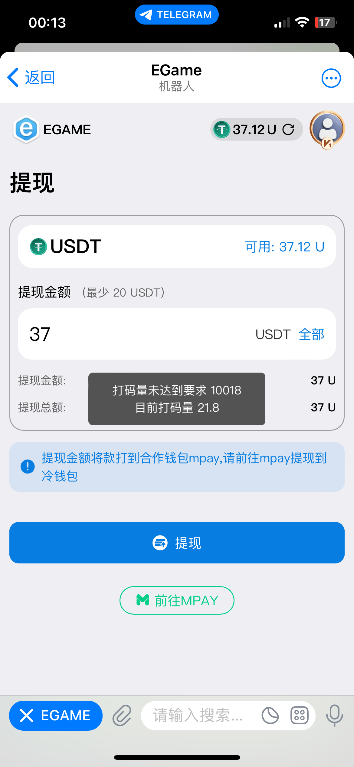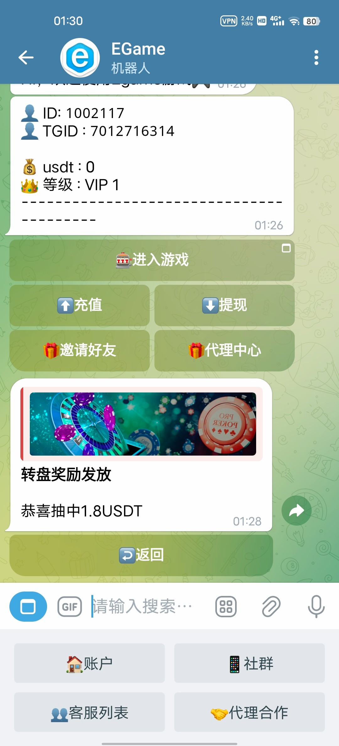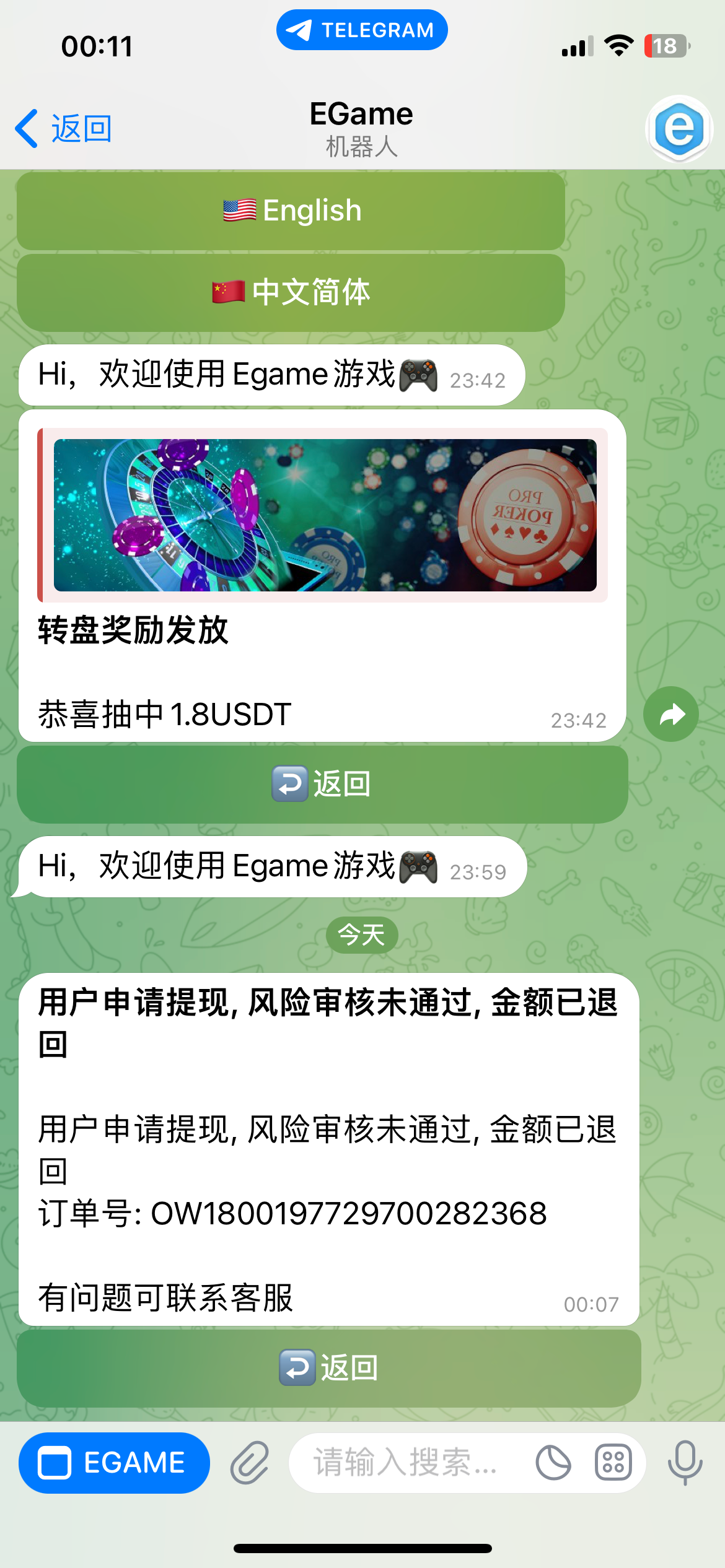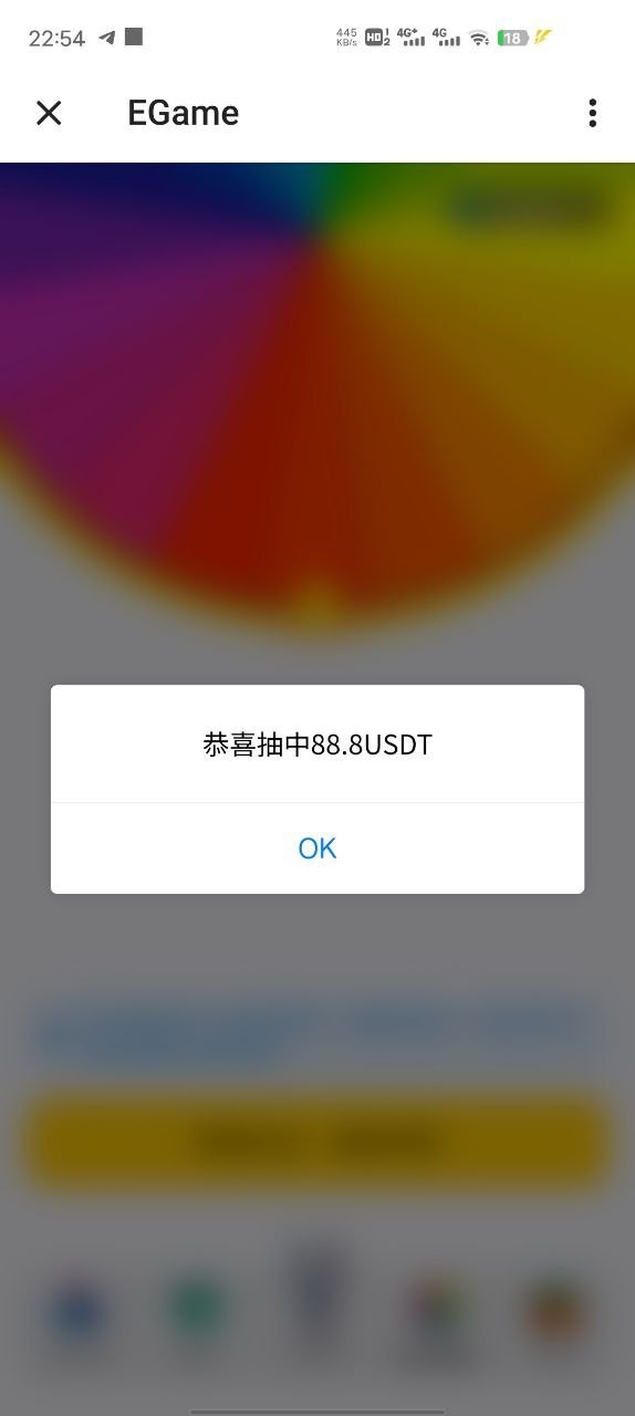 项目名称: Egame 送1.8-88u机器人: @Egame1bot点开上面机器人,进入游戏,找到每日抽奖,随机抽1.88-38.88u彩金十倍流水无限制,能提现!