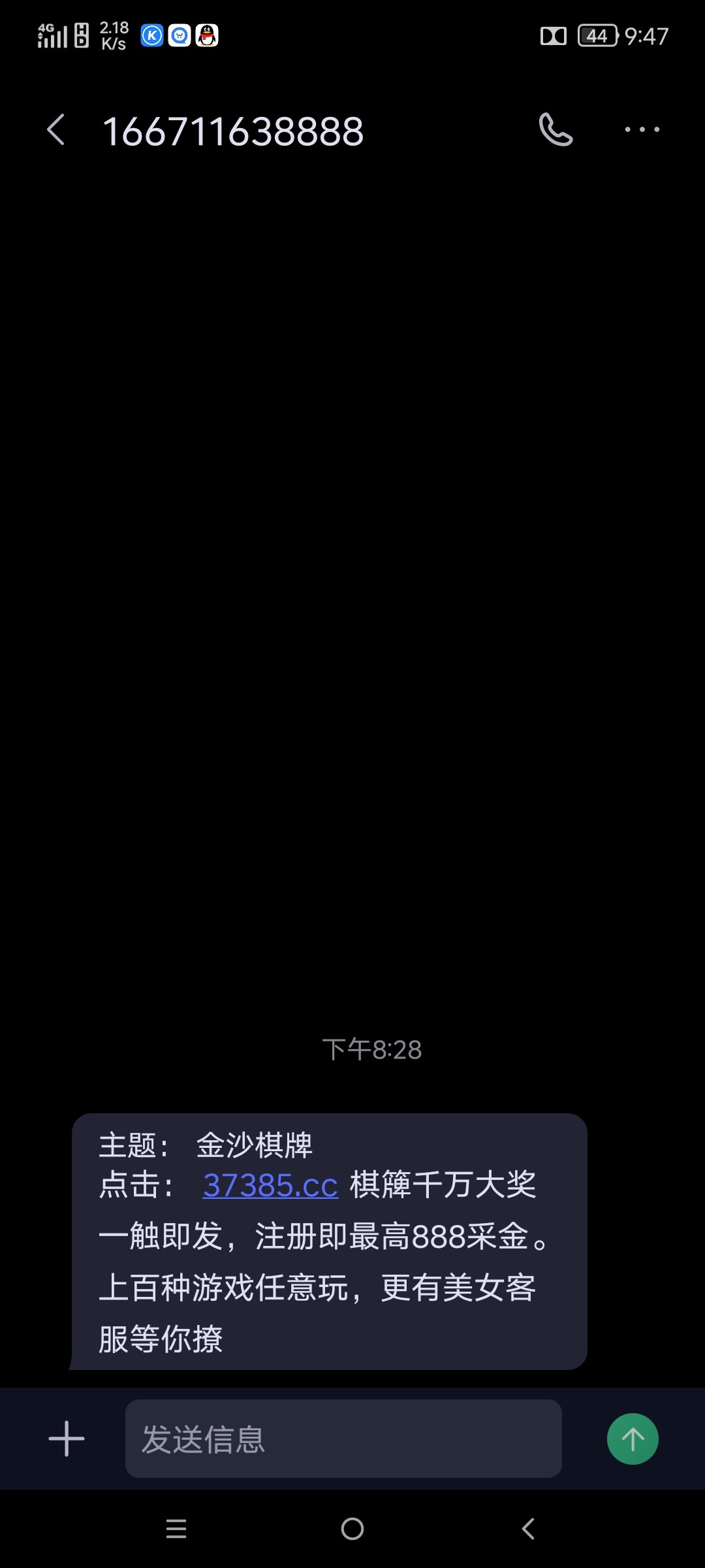 短信内容:点击: 37385.cc 棋簰千万大奖一触即发,注册即最高888采金。上百种游戏任意玩,更有美女客服等你撩