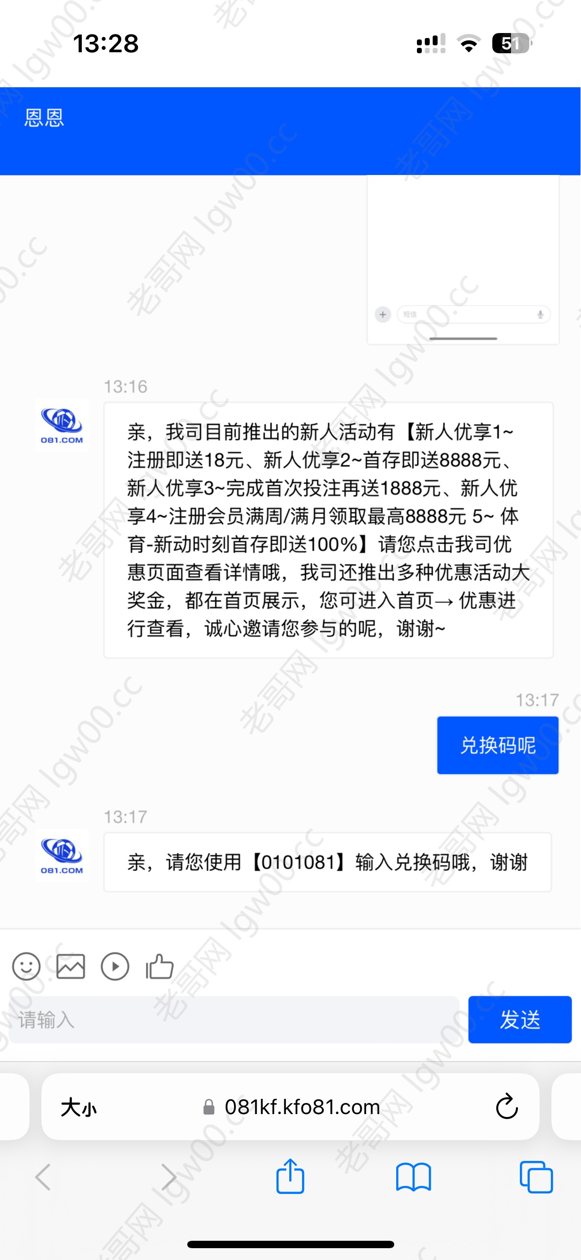 收到短信没有派送18的可以去活动中心找到短信特邀 输入代码0101081即可获得随机彩金 没有收到短信的也可以碰瓷