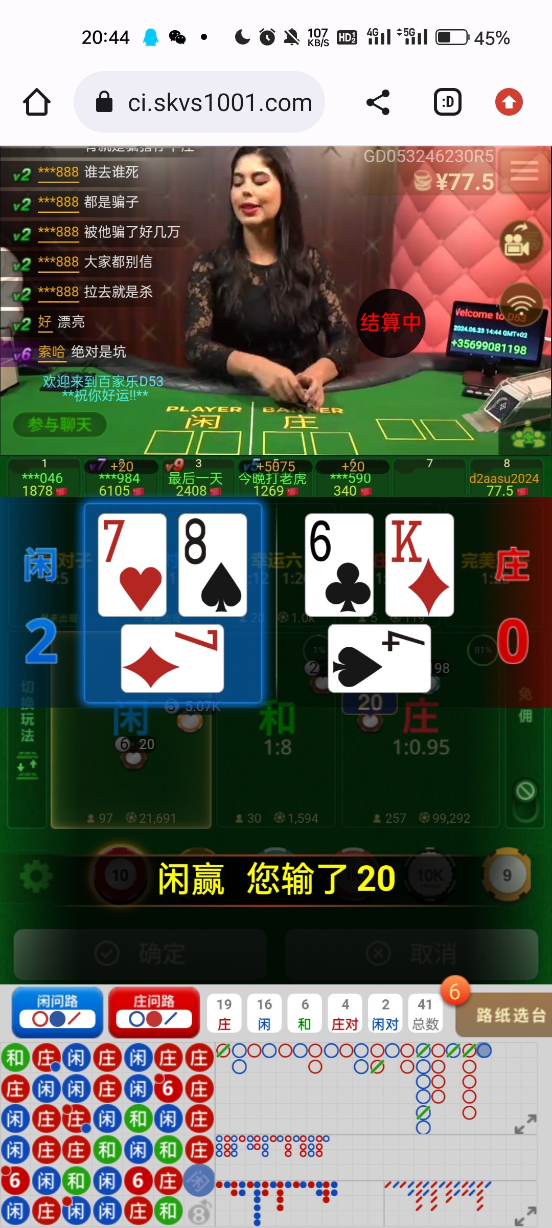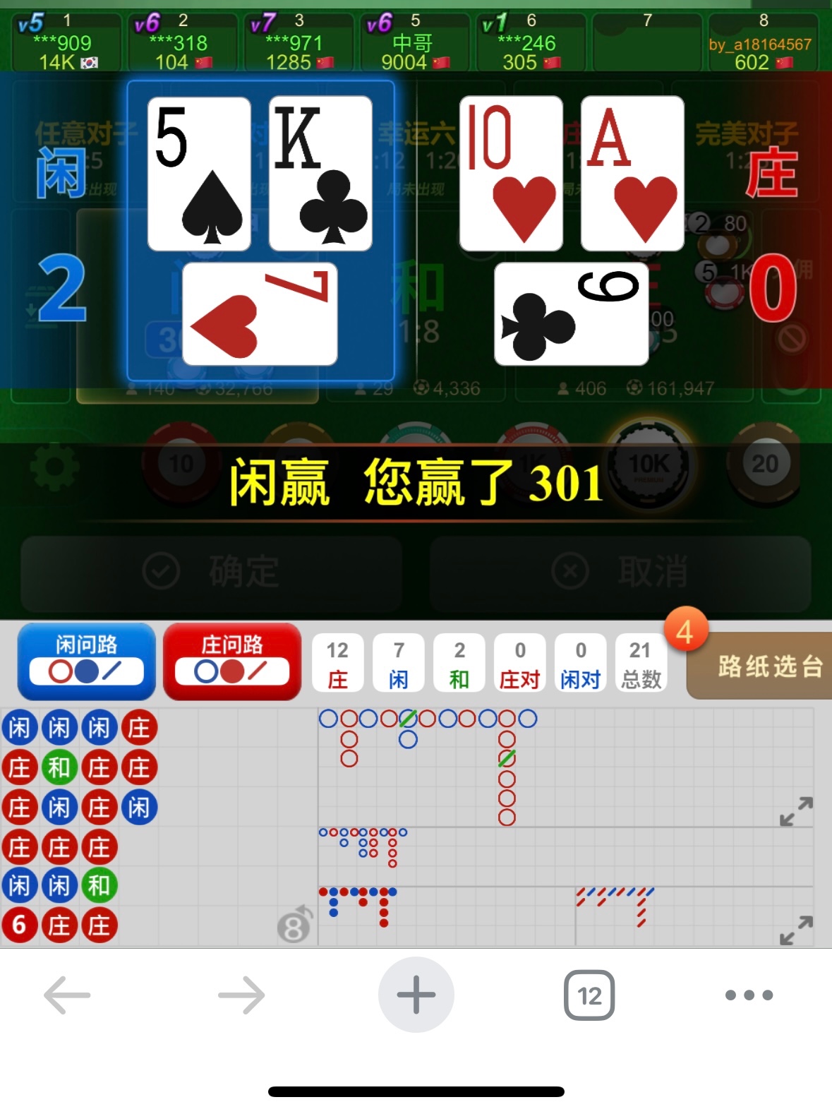 百家乐的基操,昨天500押6把 6把都是8.9点死 ,五把是直接开8.9点,还有一把补牌9杀8。