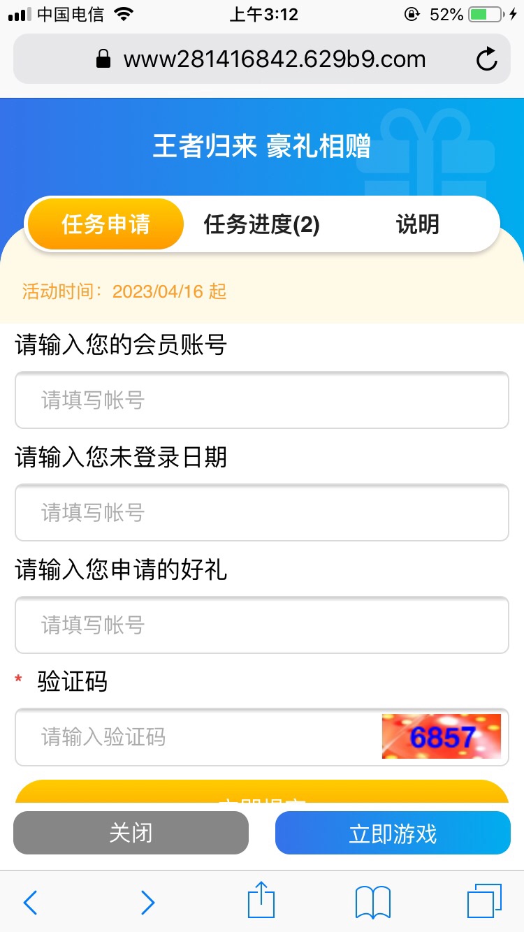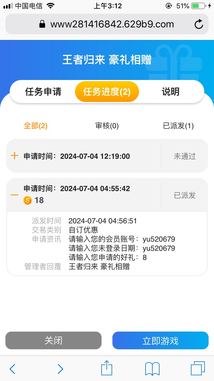 官网链接回归1,要历史充值过100的,傻逼客服说不用充值,直接任务申请,随机的,我领了18! 打出的老哥赏个猪脚!!!